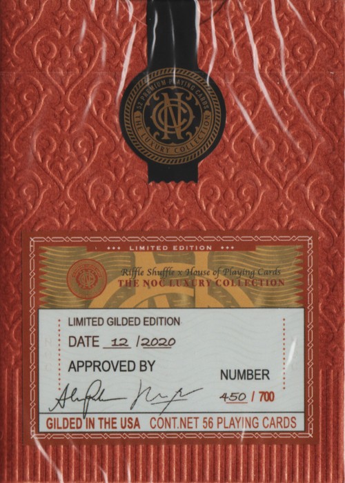 We are excited to announce the very first legendary collaboration between House of Playing Cards (HOPC) and Riffle Shuffle Playing Card Co. With over one year of meticulous planning, we are finally ready to present to you the most luxurious NOC ever made. Introducing – The NOC Luxury Collection. This Bronze deck features bronze gilding on the edges to match the deck colors and a custom designed numbered foil label. These gilded decks were exclusive to the Kickstarter campaign.