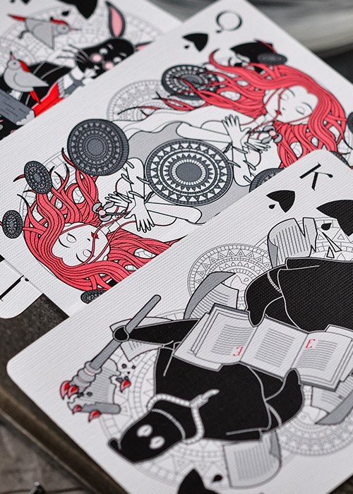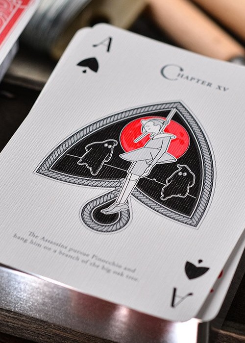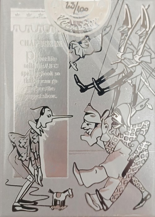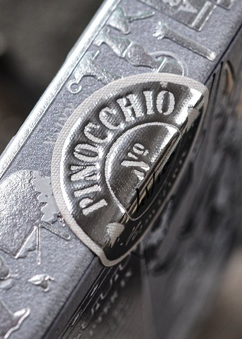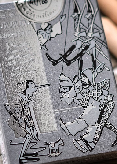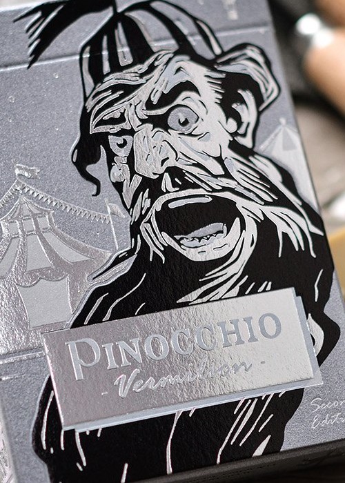 The deck belongs to the 2nd edition of the Pinocchio Vermilion decks released in 2018 and printed by The United States Playing Card Company. In particular, this variant is exquisitely silver gilded in Italy and represents the luxury peak of the new release. Dedicated to the illustrator Attilio Mussino, the tuck boxes are printed in Italy by Boschiero & Newton on high-quality pearlescent Fedrigoni paper stock with three hot foils and embossing. The total run of Pinocchio Vermillion II Edition – Silver is 100 decks. Each deck is hand-numbered on the foiled seal.