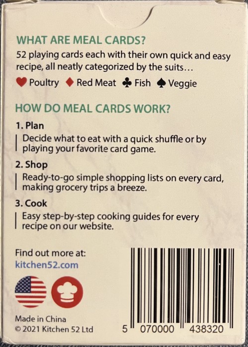 Each card has an ingredients list for a meal. Scan the QR code on each card for the cooking directions. The cards include serving size, prep time, cook time, fat content, calorie, carbs, and protein counts. If you’re not in the mood to cook, order a pizza and use this deck to play cards while waiting for the pizza!