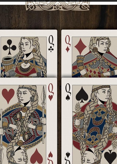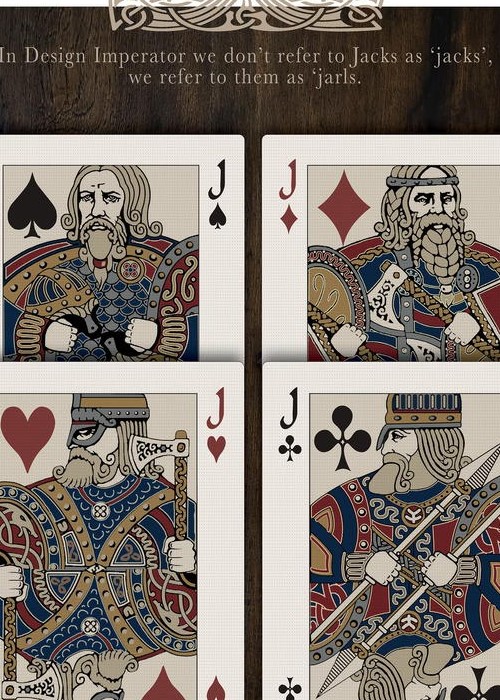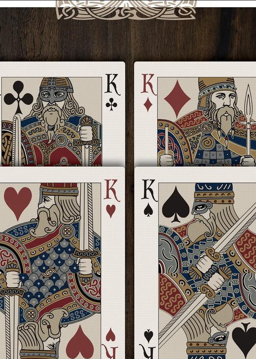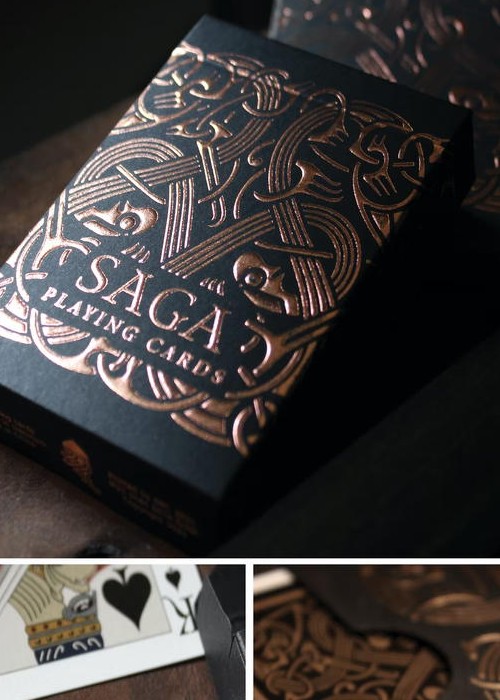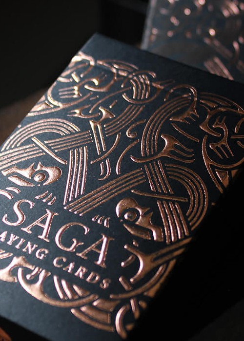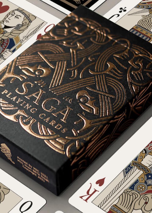 Completely original, yet familiar art style! The goal for the SAGA series was to design classic poker playing cards with an iconic nordic twist inspired by the viking era of Scandinavia. An elegant balance between playable functionality and thematic novelty. Something that is easily recognisable by players but unique at the same time. The tuck material has a raw texture for an authentic and luxury feel that compliments their respective delicate and antique metals foils well.