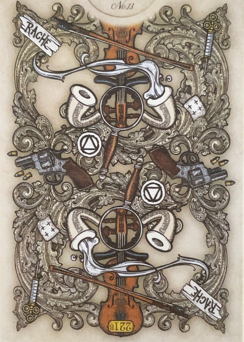 Jackson originally designed the Sherlock Holmes deck as one of his first Kickstarter decks in collaboration with the Sir Arthur Conan Doyle Estate. The initial Sherlock Holmes decks were Baker Street, Moriarty, Hounds of Baskerville, and the Holmes Edition. Jackson has taken the Holmes Edition and given it an updated design as well as placed it with the newest Sherlock Holmes card illustrations. The few difference between this deck and the most recent Sherlock Holmes deck is the new tuck case design, the use of the original back design, and there is no foil used in the cards. The tuck case has an embossed finish with gold foil. The cards were printed by Mr. Playing Card in the United States and the tuck case was made by Clover St. Press.