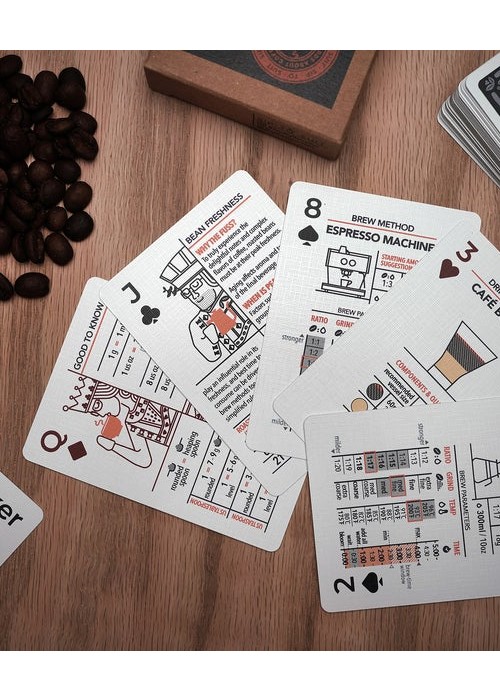 Introducing Sip-To-Suit Cards About Coffee. A deck of premium playing cards that breaks down coffee making and drink recipes into informative and thoughtful infographics. The deck offers quick-draw access to brew ratios, grind size, temperatures, and durations for popular brew methods as commonly recommended and practiced by the coffee community. There are also educational coffee tips for beginners, and drink recipes for anyone who adores coffee. Packaged as a deck of cards, Sip-To-Suit eliminates the hassle and time of sorting through online resources or piles of notes to find the right brewing parameters and drink recipes. The cards are compact enough to be stored away, yet easy to retrieve when needed, making it the perfect companion when you need quick reminders on those brew parameters. Flipping through pages of notes or resorting to online resources to locate your brew preferences is slow and inconvenient, especially when you haven’t had caffeine yet! The Sip-To-Suit Cards quickly provides the essential information you’d need to finish your ideal brew! All Method Cards indicate common brew values as recommended and practiced in the coffee community around the world.