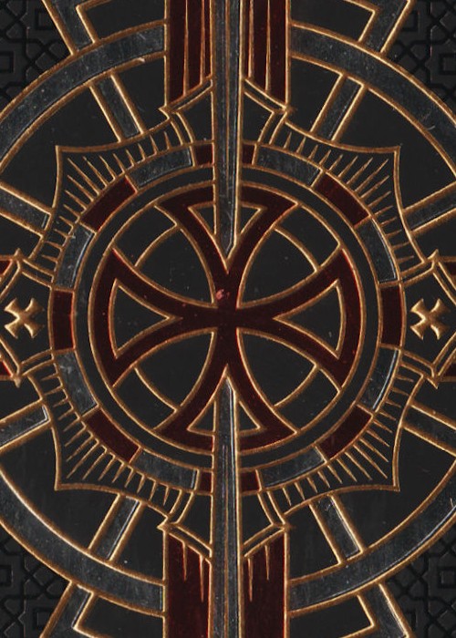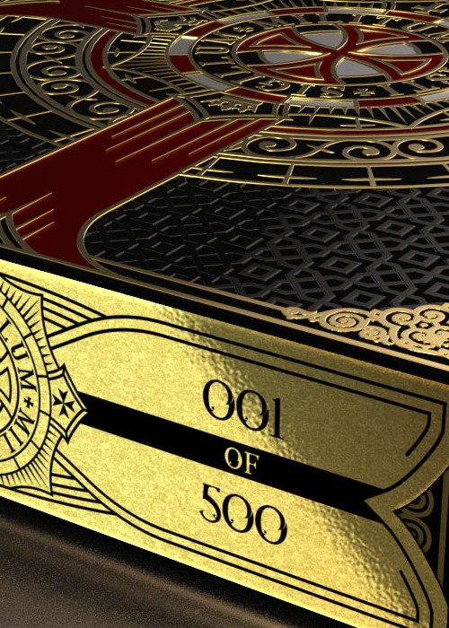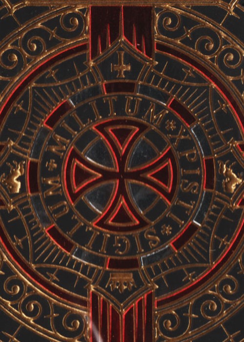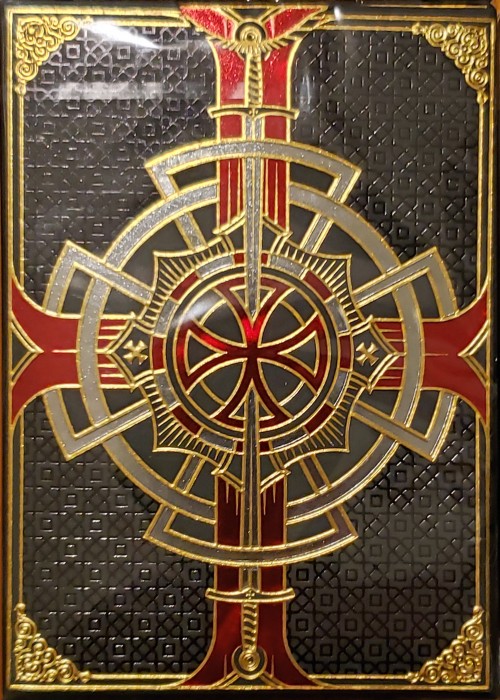 The backs in red/blue, black and gold/copper shows the cross and the sword, symbols from the Templar imagery, in an elaborate symmetrical composition. That symbology is also present in both jokers.
