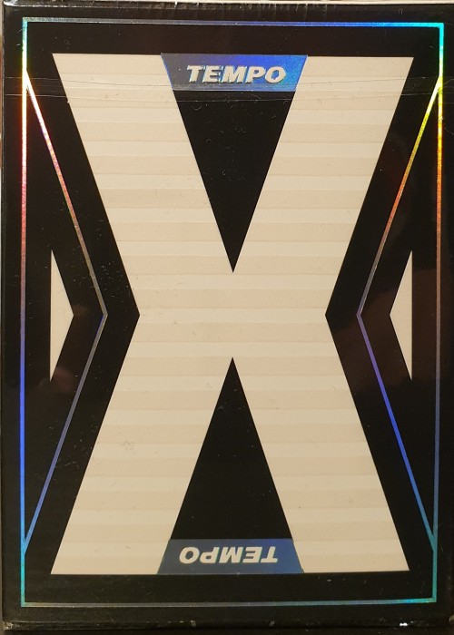 Tempo is a deck series produced by the Ark Playing Card Company featuring Tempo Original, Tempo Lab Original, Tempo Plus, Tempo Lab Plus, as well as gilded editions of each. Funded via Kickstarter in 2021, these cards feature multiple innovative features in each deck designed toward cardistry usage. This deck, the Tempo Lab Plus, features the same mechanical style tuck box of its Lab Original brother, allowing the user to release the front flap and lightly pull toward the user, activating a folded mechanism that flips the remainder of the tuck upwards. This allows the cards to be slid toward the user and removed from the tuck. This tuck also features UV reactive ink which highlights purple when exposed to UV radiation. Otherwise, the standard and minimalist black and white tuck remains. This deck also featured inclusion within a custom, telescoping display box which included an aluminum UV light within.