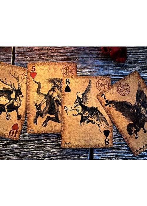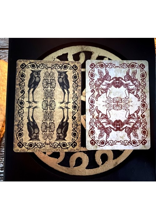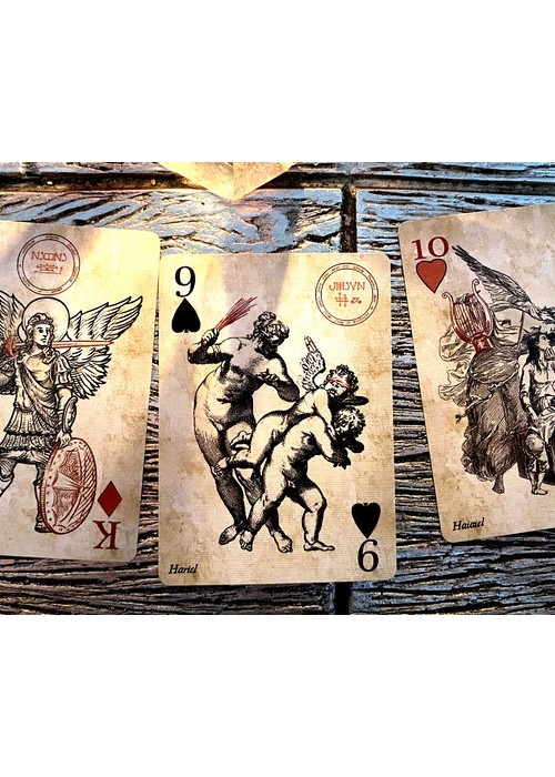 https://www.kickstarter.com/projects/travismchenry/the-devils-own-an-angels-own-playing-cards/description These decks were designed around the Minor Arcanas of the creators two previous Tarot decks: The Occult Tarot (also known as the Demon-Possessed Tarot) and The Angel Tarot (also known as the Angel-Evoking Tarot). Each card has been matched to an equivalent card from those decks, containing the same spirit. **Images in Gallery reflect BOTH The Devil’s own AND An Angel’s Own Playing Cards. They were created at the same time.