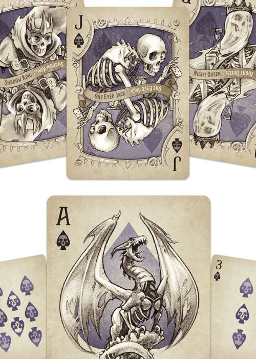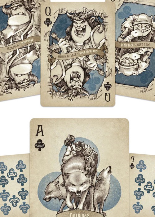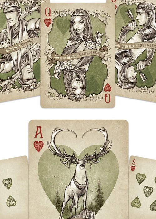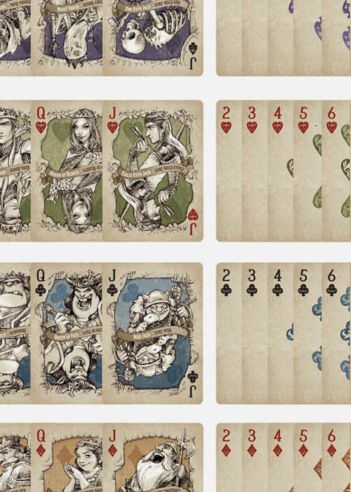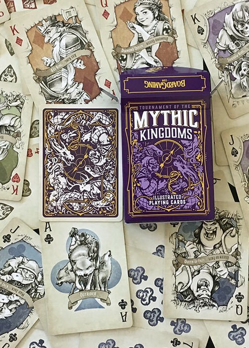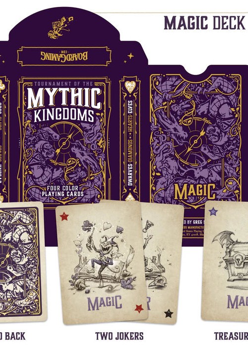 Tournament of the Mythic Kingdoms is a fantasy-themed set of standard playing cards (52 cards + 2 jokers + 2 extra cards) printed by the USPCC on Bicycle’s premium grade paper. Illustrated by Greg Swearingen with amazing attention to detail, these cards will add a new layer of fun as you use them to play your favorite traditional card games.