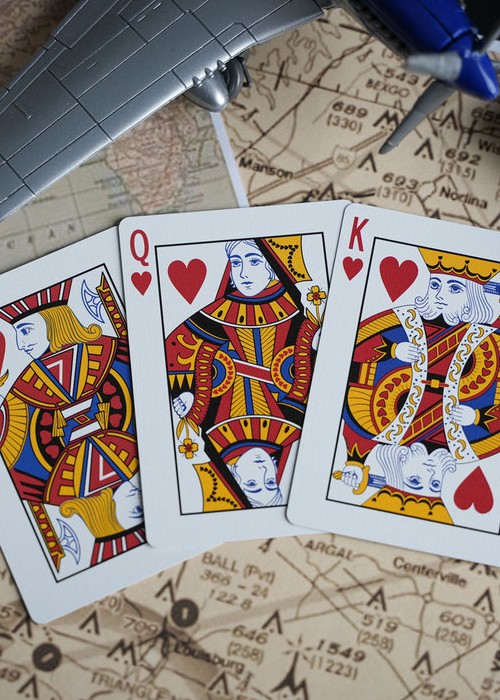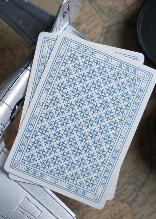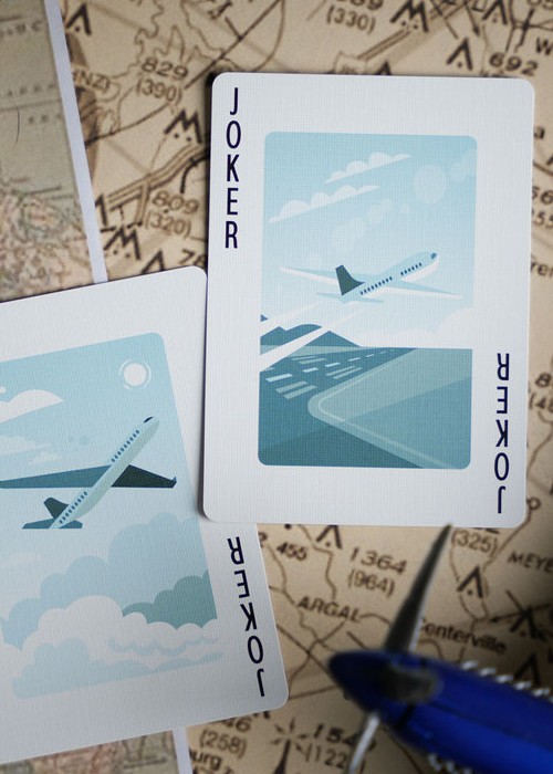 The back design features airplanes & clocks in a patterned design with a white Bordered. The blue-green color scheme is the perfect choice for a timeless deck. The faces include a custom Ace of Spades and two custom Jokers alongside the Penguin Custom Standard court & number cards. Two gaff cards are included for magic tricks.