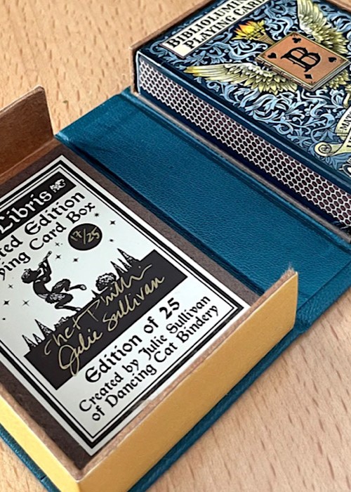 Biblioluminous card deck with limited edition custom box. Edition of 25 clam shell style box. Box is created with blue leather, paper and board construction, and gold foil stamp. Gold painted box sides to emulate gilt edging. Edition info represented as book plate with edition number, signed by the Chet Phillips and Julie Sullivan of Dancing Cat Bindery. Biblioluminous Playing Card Deck included in custom box. A plastic coated poker sized deck of playing cards showcasing 58 individual matchbox styled designs highlighting famous literary books, plays, fables and short stories. Illustrated by Chet Phillips. Deck includes 2 Jokers and 4 Wild Cards. Literature subjects represented in the deck: Wolf in Sheep’s Clothing/Aesop’s Fable, The Raven, Moby Dick, Of Mice and Men, The Metamorphosis, Hitchhiker’s Guide to the Galaxy, Peter Pan, Firestarter, Hamlet, Pride and Prejudice, The Merry Adventures of Robin Hood, Alice in Wonderland, Macbeth, The Fox and Grapes/Aesop’s Fable, Dracula, Don Quixote, The Life of Pi, Lord of the Flies, War of the Worlds, Wind in the Willows, Lord of the Rings: The Fellowship of the Ring, Waiting for Godot, Joy Luck Club, The Hound of the Baskervilles, The Snow Queen, Lord of the Rings: The Return of the King, The Story of King Arthur and His Knights, Antony and Cleopatra, Twenty Thousand Leagues Under the Sea, The Handmaid’s Tale, Death of a Salesman, Beowulf, Alice in Wonderland, The Golden Compass, Fahrenheit 451, A Confederacy of Dunces, Divine Comedy, The Call of Cthulhu, The Lion and the Mouse/Aesop’s Fable, I Know Why the Caged Bird Sings, The Crucible, A Christmas Carol, The Wizard of Oz, Dune, Animal Farm, To Kill a Mockingbird, Odyssey, Frankenstein, Tortoise and Hare/Aesop’s Fable, Kurt Vonnegut Joker, Mark Twain Joker, The Lottery, The Tell-Tale Heart, The Legend of Sleepy Hollow and The Monkey’s Paw.