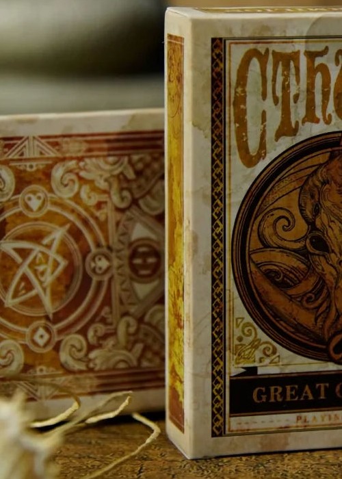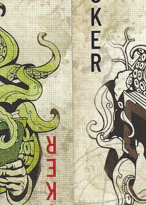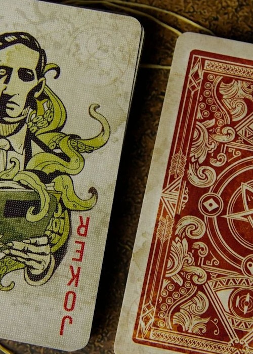 This 54-cards poker deck features exclusive Cthulhu-themed artworks based on Lovecraftian characters and scenes depicted. Cards come in high-quality printing with 300-GSM double copper paper embossed on both sides. The finishing is modified to protect the cards against scratches and stay ultra-smooth for playability while bouncing a subtle amount of light off. The Jack, Queen, and King cards (slightly different for each suit) are based on Shub-Niggurath, Yog-Sothoth, and Nyarlathotep. ♠ Ace of Spade: Hohenheim’s Heart ♥ Ace of Heart: The Scary Truth ♣ Ace of Club: The Creature from the Woods ♦ Ace of Diamond: The Disciple of the Abyss Two-Ten are nine illustrations repeated in each suit.