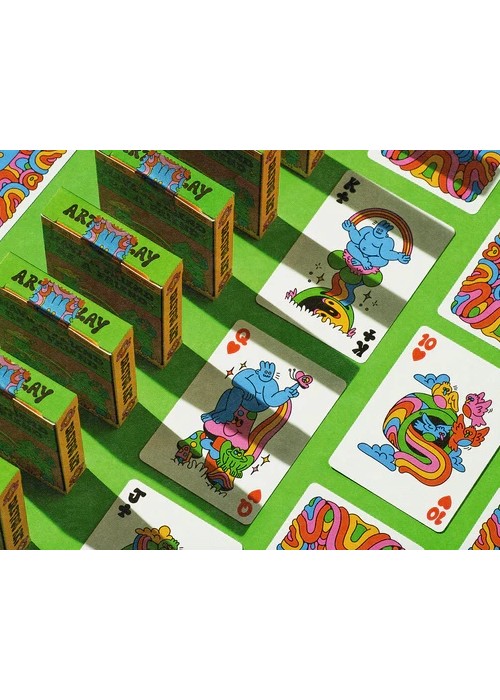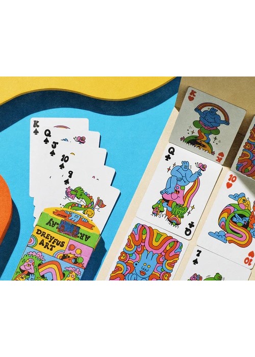 Produced in collaboration with the wildly imaginative illustrator Ashley Dreyfus this fully custom deck of cards features a colorful cast of characters drawn in a whimsical, psychedelic style. Join Dreyfus’ alter egos on an adventure through a magical forest full of smiley mushrooms, playful dragons, double rainbows, singing birds, and a robot coffee maker (because everyone needs coffee). It won’t take long to appreciate why Dreyfus’ joyful art has found passionate fans around the world.