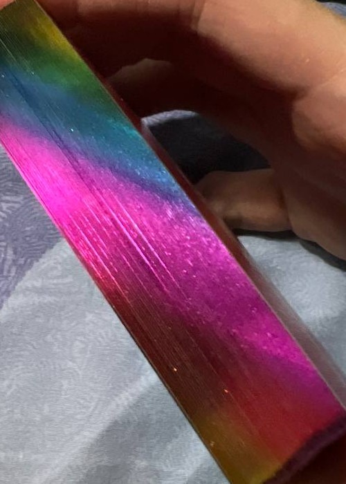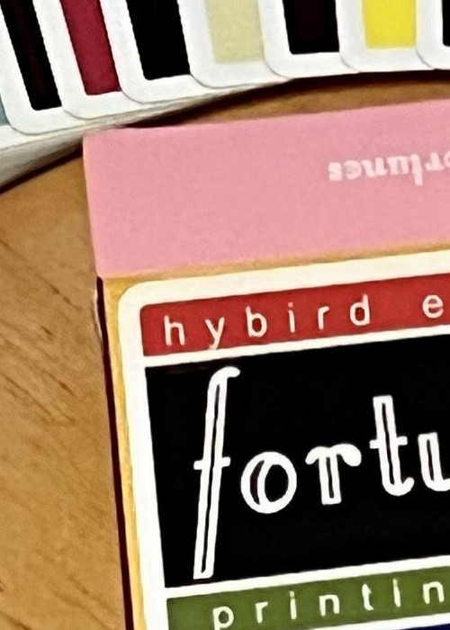 Fontaine has been one of the most notorious cardistry brand ever existed in the cardistry community. While they are known for the very minimalistic designs, the business practice surrounding the brand have very bad reputations. Alas, HK Playing Card comes up with a parody deck to Fontaine. Introducing Hybrid Fortunes Printing Cash. The deck consists of 52 cards + 2 Jokers, and every card will feature a different back. Each of these 54 different backs correspond to each edition that Fontaine had released over the years – the color variants, the collab variants, the mystery pack variants. The deck is printed by Hanson Chien Playing Cards Co. There is the GILDED version of the deck – the cards will be gilded with rainbow gradient texture. There is no significant difference between the Standard and Gilded, as there is no seal or any clear indication – the only way to tell the difference is that the deck will be encased in a deck sleeve with a sticker [as shown in this deck scan]