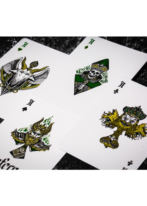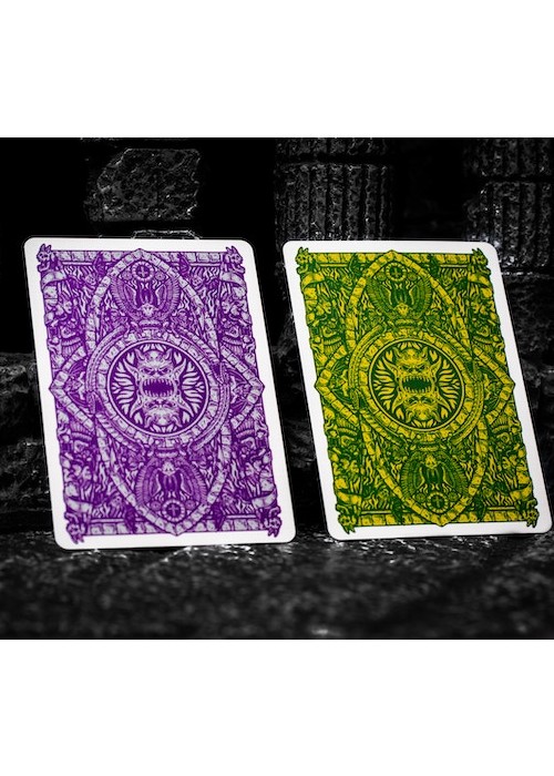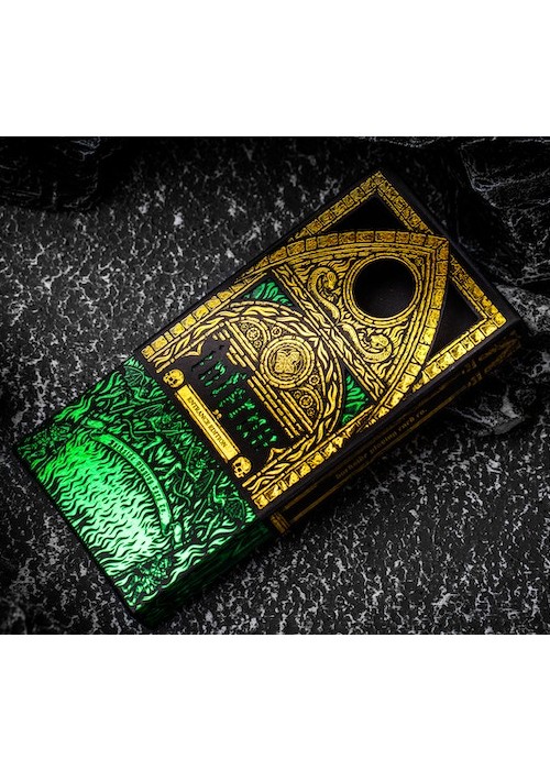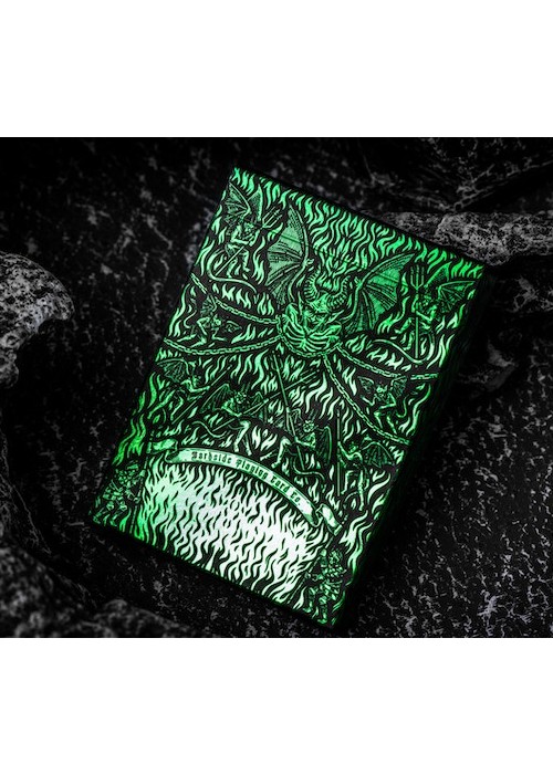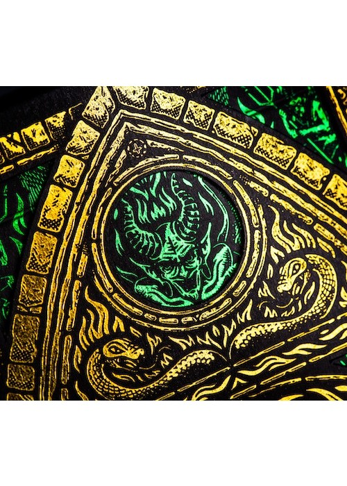 The Inferno deck features a two-piece tuck case. The outer sleeve acts as a window for you to stare into the abyss of the Inferno. Each cutout allows you to see the actual tuck case with intricate details. • Removable Outer Sleeve with gold hot foil stamp artwork with Laser Cutting Technology. • Green hot foil stamp on the Pure Black Premium 300gsm Matte Finish Tuck Case. • Interact-able laser cut outs with corresponding illustrations when handling the tuck case. • Limited to 2000 Decks Each with Custom Foiled Number Seal. • Cards Printed by Taiwan Playing Card Company with their Luxury Paper Stock.