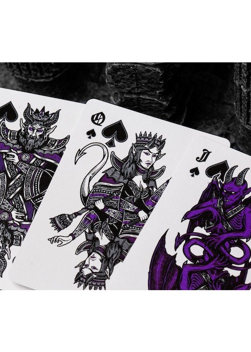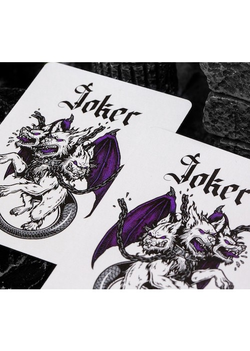 The Inferno deck features a two-piece tuck case. The outer sleeve acts as a window for you to stare into the abyss of the Inferno. Each cutout allows you to see the actual tuck case with intricate details. • Removable Outer Sleeve with silver hot foil stamp artwork with Laser Cutting Technology. • Purple hot foil stamp on the Pure Black Premium 300gsm Matte Finish Tuck Case. • Interact-able laser cut outs with corresponding illustrations when handling the tuck case. • Limited to 2000 Decks Each with Custom Foiled Number Seal. • Cards Printed by Taiwan Playing Card Company with their Luxury Paper Stock.