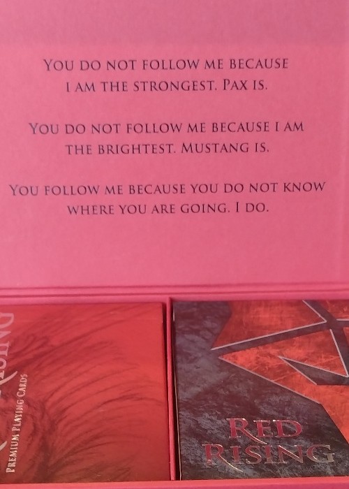 The signature gilded edition deck is one of two decks included in the two deck box set. Both decks are hand numbered x/200 and signed by Pierce Brown, the author of Red Rising. https://www.kickstarter.com/projects/randybutterfield/red-rising-playing-cards/description Based on the Red Rising books by Pierce Brown The Tuck Box and Back Card for the House Mars Deck prominently features the House Mars sigil. It has rough texture imagery within the wolf head and is set off nicely with the contrast of the black rock texture background. Scattered throughout the Tuck Box and Back Card are elements of gold leaf designs. They symbolize an Iron Rain. The Tuck Box will be printed on a premium paper stock. The Exterior will be printed with 4-Color Process + Silver FOIL + Clear UV Spot Ink on the House Mars and Red sigils. The Interior will be flood-coated in PANTONE Black and the pattern will be stamped in Red FOIL. It will be extremely luxurious.