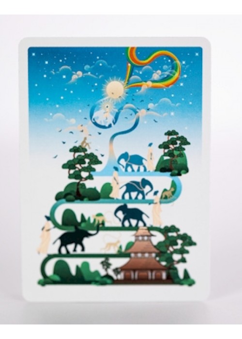 Samādhi: Stato di coscienza di unione con il tutto. Dalla terra, calmando la mente si può raggiungere il divino. In questo mazzo sono rappresentati i passi verso il Samādhi. – La scimmia rappresenta i pensieri che appaiono di continuo nella nostra mente, difficili da domare, ogni nuovo pensiero sembra più importante di quello prima. – L’elefante è la nostra mente, irrequieta dietro ai pensieri, che si lascia trasportare dalle passioni, desideri, emozioni e sonno. – Il monaco siamo noi, in balia di quello che succede nella mente. – La corda è la consapevolezza, la presenza mentale e il ricordo di sè. Una volta calmata la mente, domate le passioni, l’individuo si assorbe con il tutto, torniamo ad essere il tutto. E’ una via di purificazione e dentro il Samadhi si possono vedere e capire tante cose di sé e del mondo. “Con le palpebre chiuse, si intravede un chiarore, che con il tempo, e ci vuole pazienza, si apre allo sguardo interiore.”