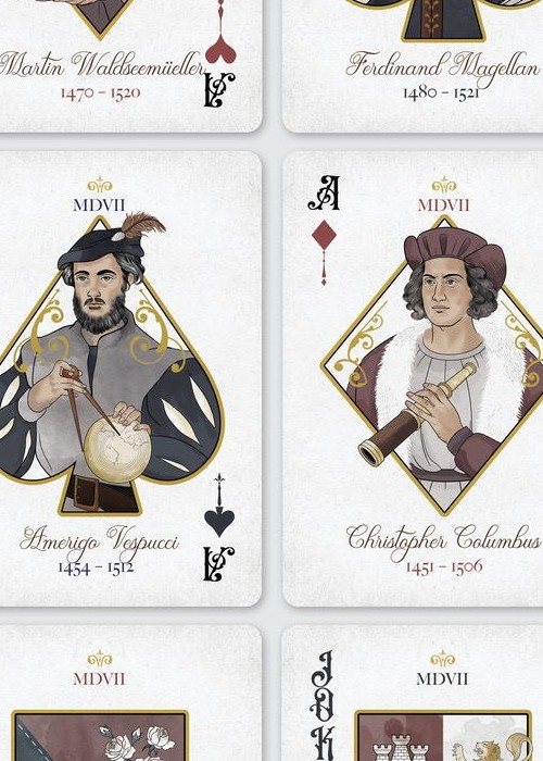 https://www.kickstarter.com/projects/newworlddeck/the-new-world-playing-cards The New World deck tells the story of how America should have been called Columbia, had it not been for the first ‘world map’ published in 1507. Even though America was discovered for Europeans by Christopher Columbus, it was named after another explorer named Amerigo Vespucci, because the first world map used Vespucci’s name instead of Columbus’ name. The Universalis Cosmographia was created in 1507 by German cartographer Martin Waldseemüller. This deck commemorates that age of exploration and the first world map. Design includes a full original set of court cards, original aces, back of card design and inside and outside tuck box design. Limited edition. Single print run. Gold foil included in the intricate tuck box design. The deck will also include a copy of the original 1507 map of the world, which was the first map ever to feature the word ‘America’, which became know as the New World. 310gsm premium German linen stock Beautiful original illustrations by artist Erik Suswanto Printed in Europe by Noir Arts The court cards feature Columbus, Vespucci and the other two luminaries in this historical story: Magellan and Waldseemüller. Magellan is included because he completed what the others set out to do – circumnavigate the world. And Waldseemüller is included because his map changed history. The Jokers are the family coat of arms of our two main protagonists – Columbus and Vespucci. And the court cards are a beautiful re-rendering of the Aleseva standard court cards created by our artist Erik Suswanto.