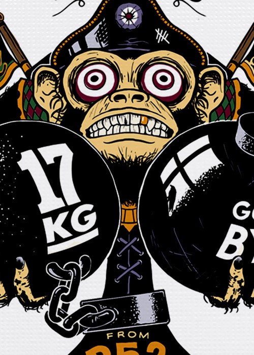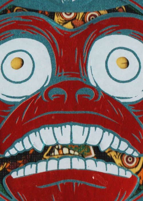 The Brass Monkey deck features pearlescent teal and vibrant orange across the barrel embossed case. 17 marks scratch across the top signifying the date of the launch and the number of Stockholm17. On the face of the deck is the Brass Monkey himself with a custom diecut to show a peek of what is inside.