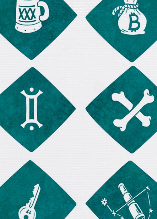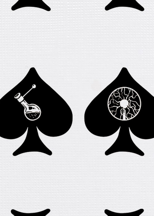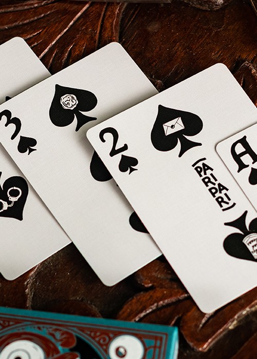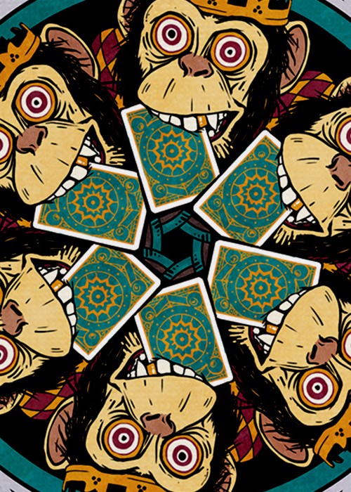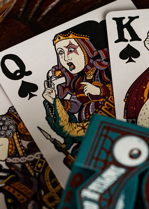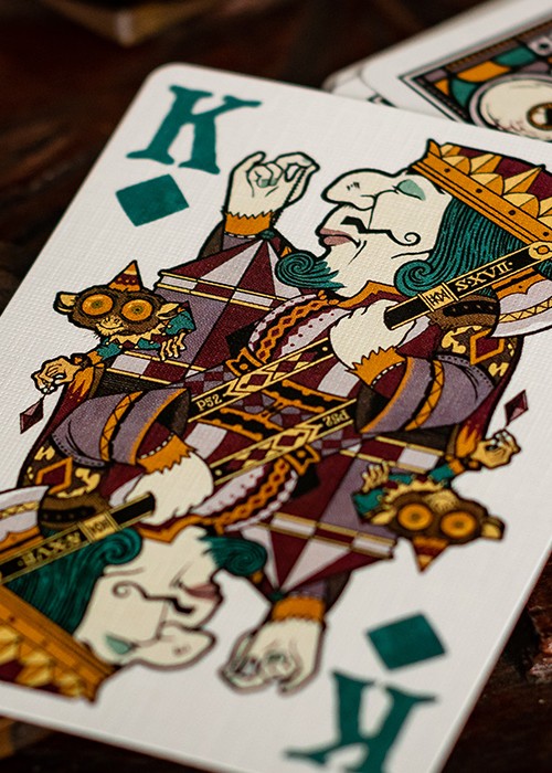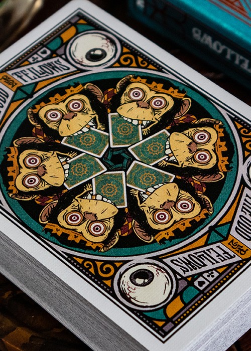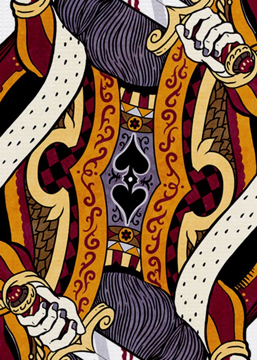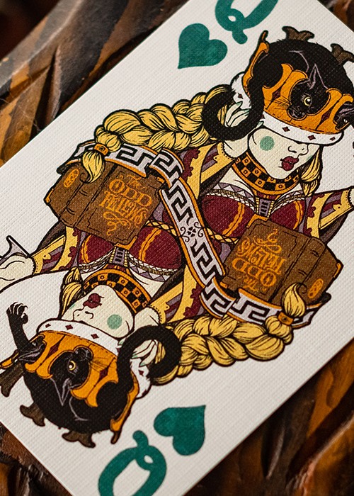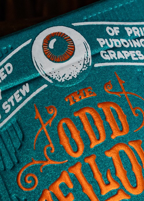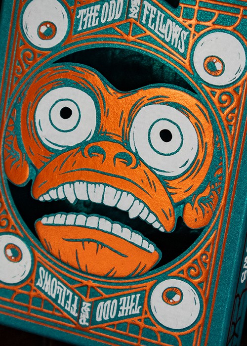 The custom illustrated court cards feature a wildly intoxicated bunch with custom illustrations for each individual pip. The back designs are also 100% custom to each deck in the Odd Fellows series while still maintaining a cohesive design to maintain integrity throughout.