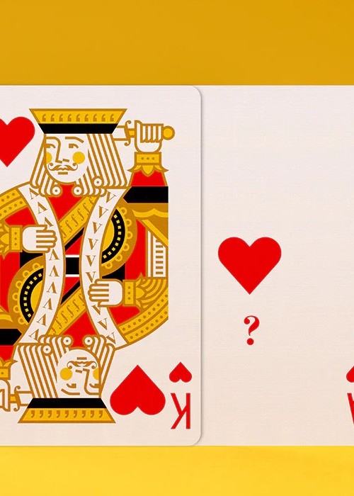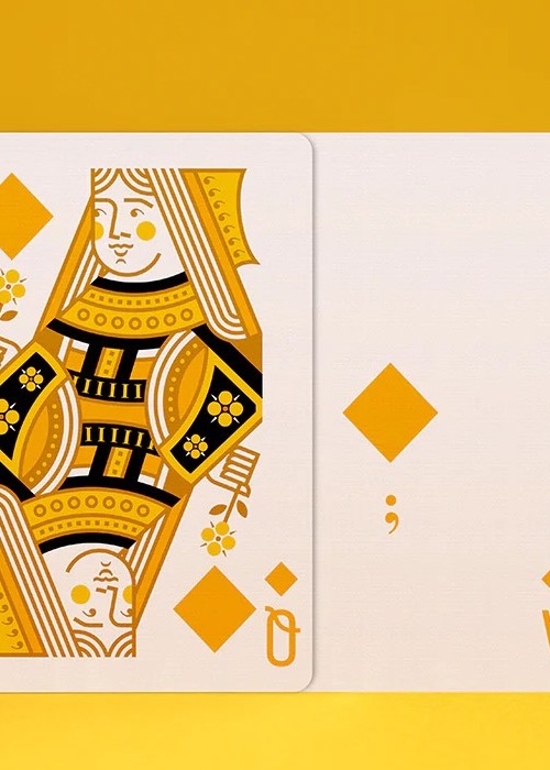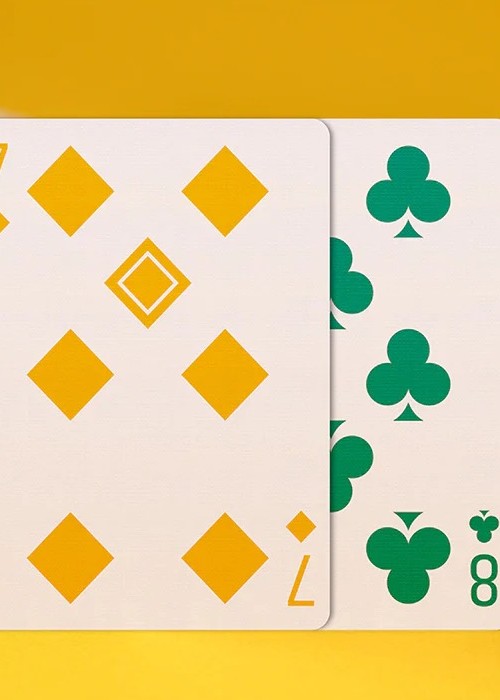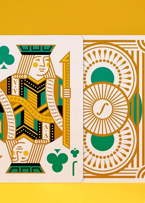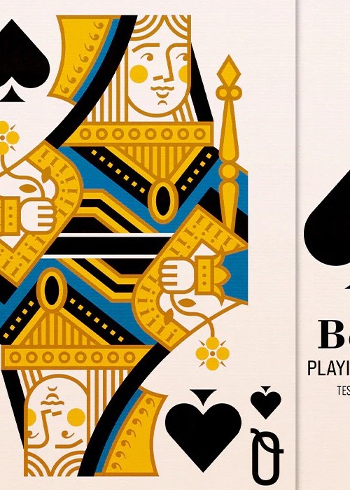 Compared to the original Bold edition from 2020, this Bold Test Run of 30 decks from late 2022 incorporates design and colour variations conceived with the game experience in mind. In particular, it is an English four-colour pack with red hearts, green clubs, amber diamonds and black spades enhanced by blue accents. Improvements include bigger pips on the numerical cards, larger illustrations on the court cards, a more clean-cut design for the ace of spades, the so-called 7bello, and more. ‘Each deck is delivered with a pre-spaced adhesive. You can choose to place it on your tuck box once the outer shrink wrap has been removed.’ https://shop.elettradeganello.com/products/bold-test-run-2022