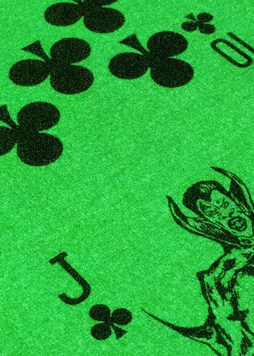 Featuring Halloween-inspired illustrations for the courts, the back design features spiderweb composed to form the word MISSING. Printed by WJPC. Released on Halloween. This is a special NOVELTY deck to it’s standard edition – a Glow-in-the-Dark deck of cards (and the box as well!). Although, due to it’s rough surface stock and ink with finishes, USE AT YOUR OWN RISK!