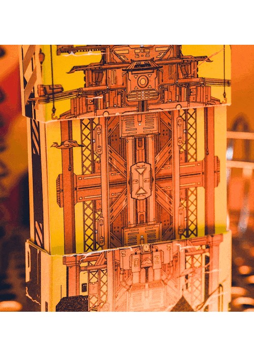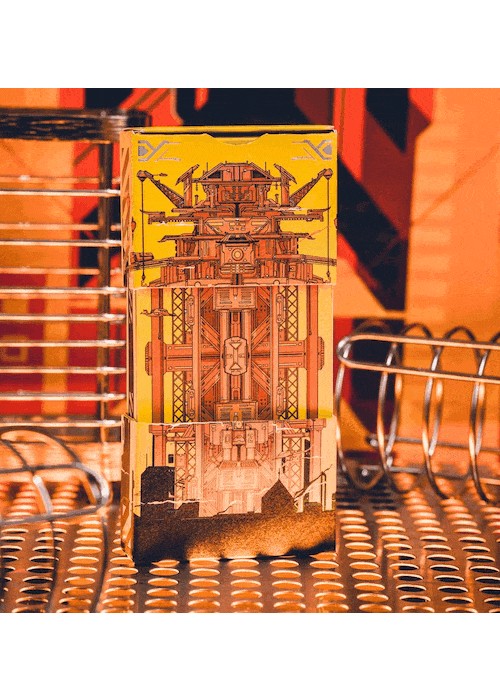 Cyberpunk Mythos is a collection of six playing cards inspired and celebrates East Asian mythologies and the cyberpunk subculture. The series featuring the exclusive drawings of 30 mythical beings and environments as described in Shan Hai Jing (a compilation of Chinese mythic geography and creatures). The beasts are imagines as cyborgs that escaped their cages from labs, prowling neon-drenched streets or watching pensively atop unreachable skyscrapers. They are illustrated for the back design, courts, and/or the diptych jokers. All of the Aces featured customized enlarged items shaped as the suits, with the Numbers using miniaturized version of them. All of the decks are printed by KingStar Playing Cards Co. (KSPCC) on 280 gsm Japanese black core paper. Two of the decks are standalones, while the remaining four decks are only available in a collector’s box set – which includes an enamel pin, a sticker pad, three postcards, and three bookmarks. PENGLAI renders this legendary mountain into an enormous mechanical lab that is vaguely reminiscent of a modern steel frame and an ancient Chinese temple at the same time. The artwork on the package shows the front view of the structure, while that on the card back shows its top view. Orange and yellow are the primary colors, exuding an air of sharp-edged excitement while maintaining a Metallic look. The box is made with premium matte stock with hot holographic stamping and embossing. The box can be expanded like that of a telescope – it shares the same design as Smoke and Mirror V8 Deluxe. The cards are gilded with holographic foil with silver stripes pattern. This deck is only available in Collector’s Box set.