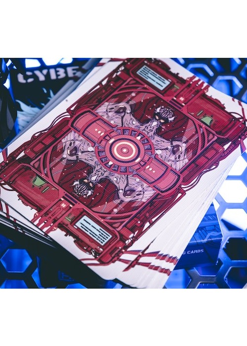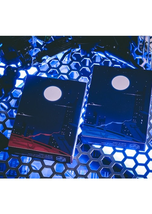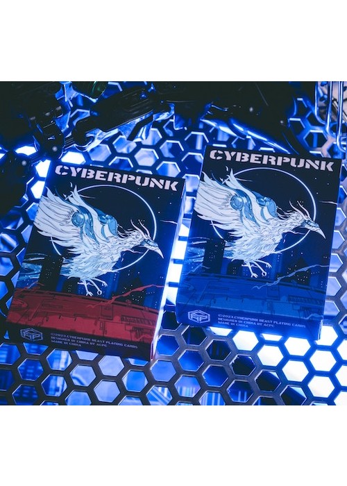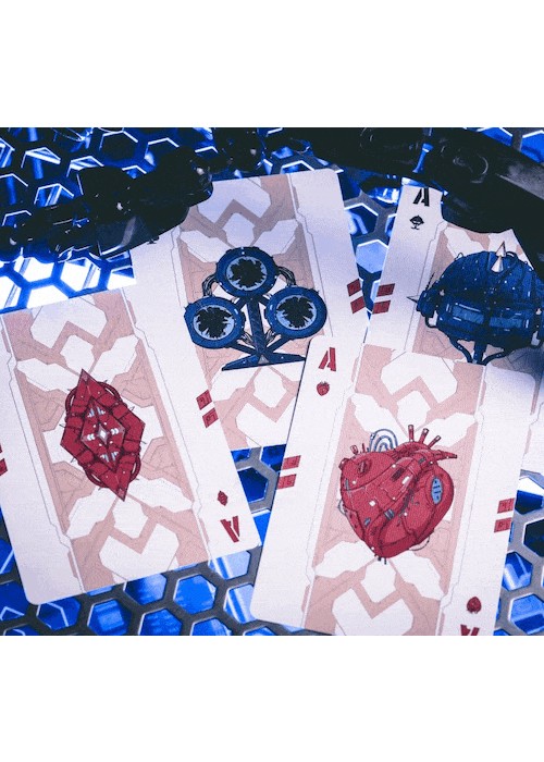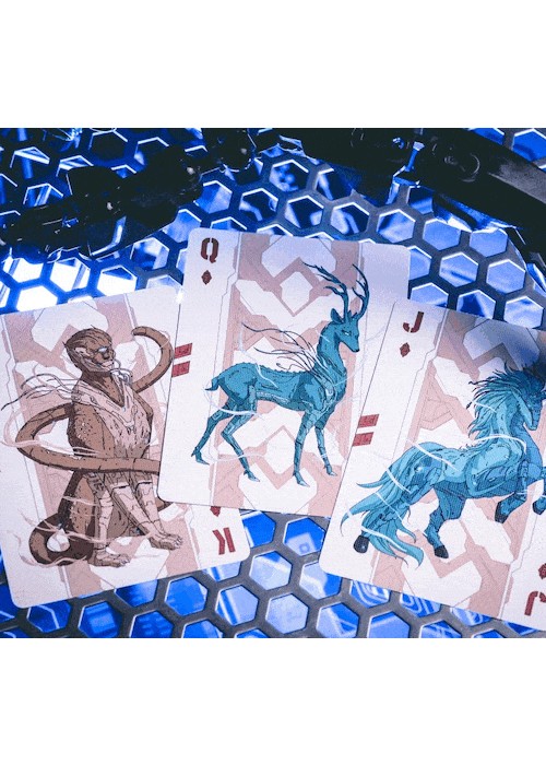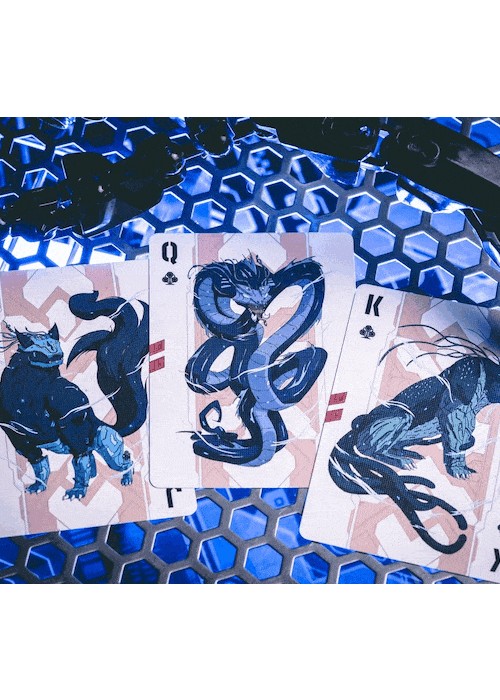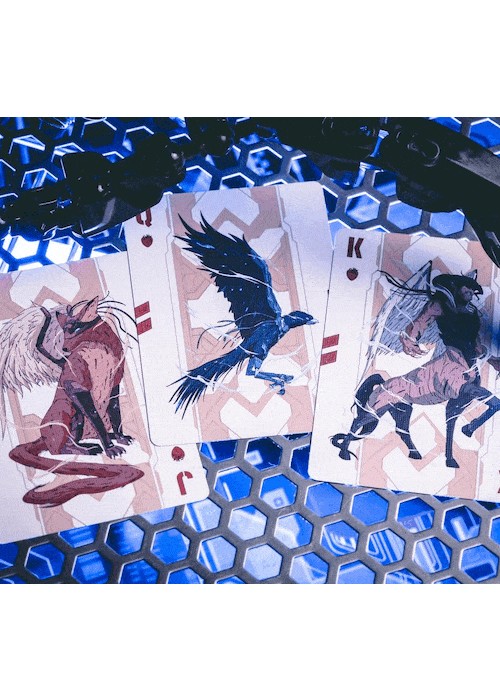 Cyberpunk Mythos is a collection of six playing cards inspired and celebrates East Asian mythologies and the cyberpunk subculture. The series featuring the exclusive drawings of 30 mythical beings and environments as described in Shan Hai Jing (a compilation of Chinese mythic geography and creatures). The beasts are imagines as cyborgs that escaped their cages from labs, prowling neon-drenched streets or watching pensively atop unreachable skyscrapers. They are illustrated for the back design, courts, and/or the diptych jokers. All of the Aces featured customized enlarged items shaped as the suits, with the Numbers using miniaturized version of them. All of the decks are printed by KingStar Playing Cards Co. (KSPCC) on 280 gsm Japanese black core paper. Two of the decks are standalones, while the remaining four decks are only available in a collector’s box set – which includes an enamel pin, a sticker pad, three postcards, and three bookmarks. SANZU JINWU comes in red and blue editions. The card’s back design depicts the legendary sunbird being trapped in lab equipemtn before it escapes. The cards are printed with air cushion finish with 4-color spot coloring. The box is using premium matte stock with soft touch lamination. The Red edition features cards gilded with red glitter holographic foil.