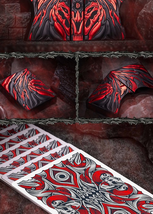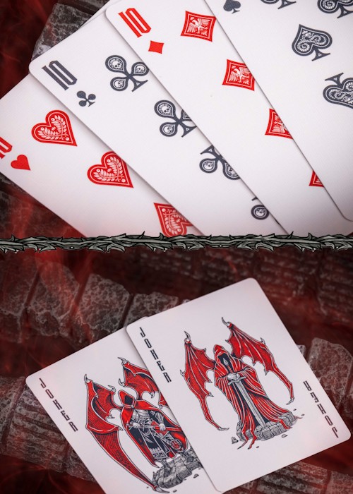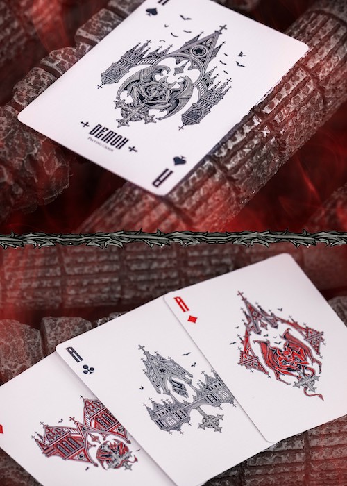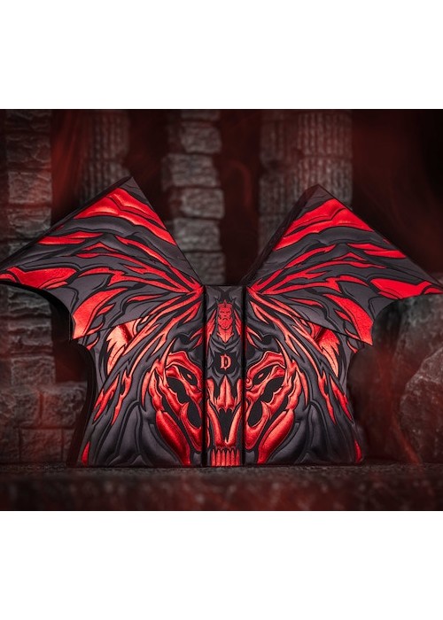 The Vengeance Edition, a striking contrast to the Gigantic Edition with its more restrained yet familiar appearance. However, don’t be deceived by its subtle look, for the Vengeance Edition holds a captivating secret. With a simple lift of the batwing, you gain exclusive access to its hidden treasures. The back design features organic Bordered of the grotestque demon showing its teeth. The courts are two-way illustration.