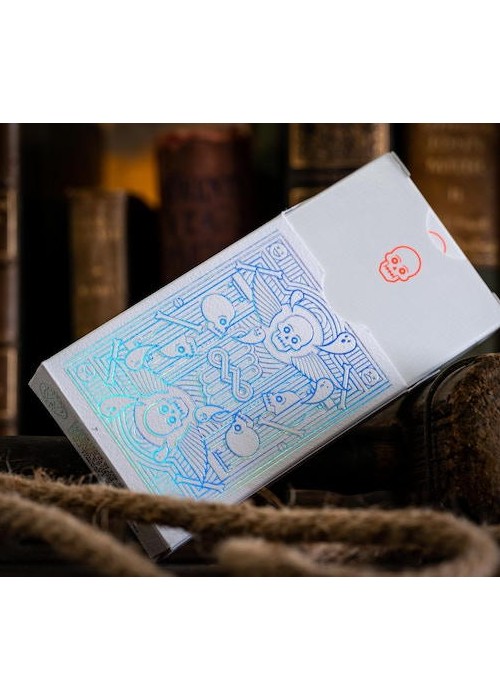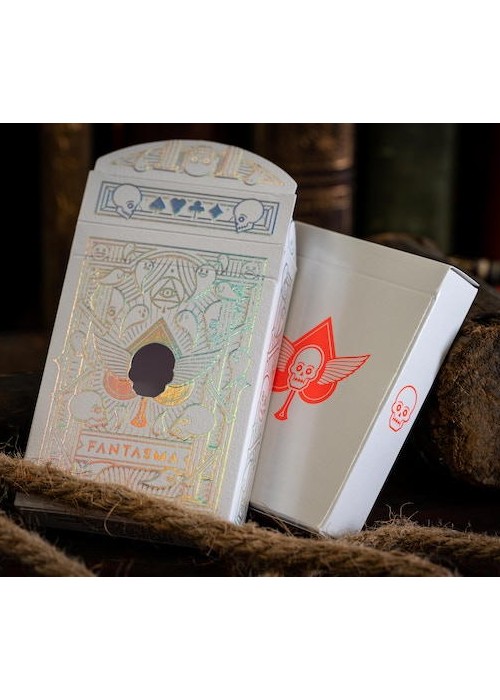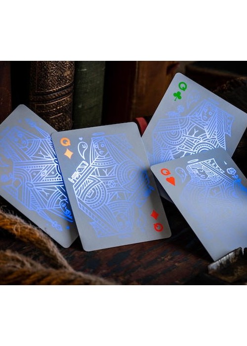 Fantasma is a series of poker playing cards designed by TWI (Thirdway Industries), inspired by Ghosts. This project is experimental, and marks the first deck by TWI (Thirdway Industries) to be printed almost entirely with invisible ink. The court cards are fully custom, intricate and invisible under normal light. Only a blacklight reveals the design! The indexes are printed with Neon Ink, which is visible in normal light but fluoresces under blacklight, becoming more vibrant.
