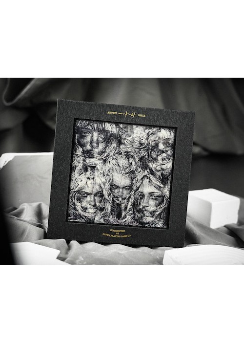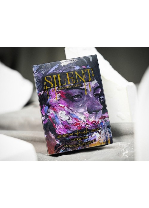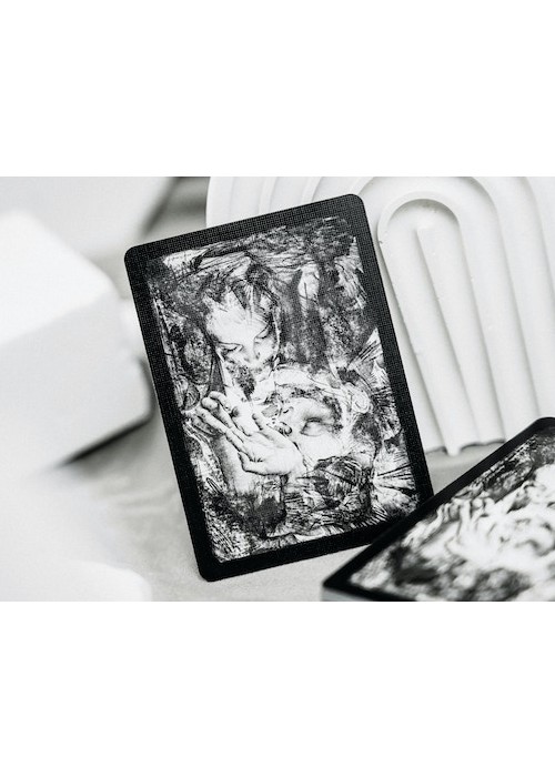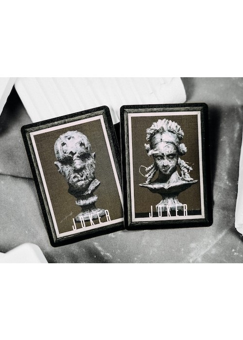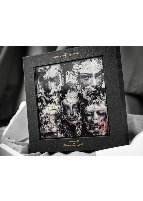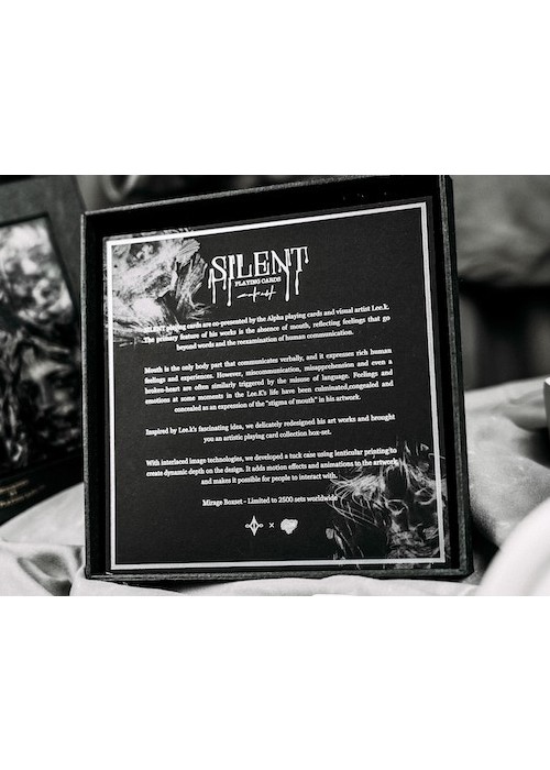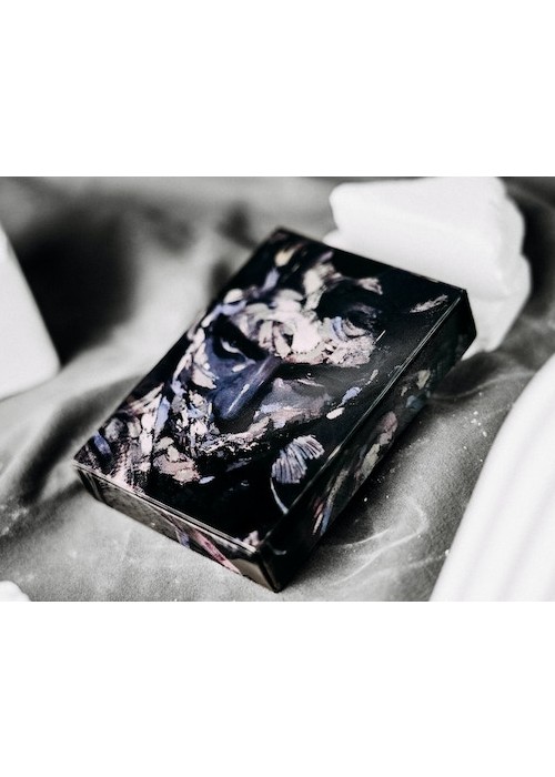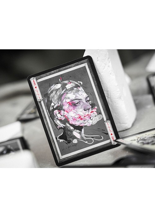 Silent Playing Cards is a series of decks showcasing the amazing works of Korean artist Lee Killust. His illustrations are exhibited in a form of 52 playing cards. The artworks of Lee.K presenting portrait paintings of people without their mouths, symbolizing the silenced words of expressions. Mirage Edition features tuck box made of lenticular lens grating art, in which the artwork changes as you tilted the box. It is a set of 2 decks in a collector’s box, also have grating art. The set is made with the technical support from ARK Playing Cards. This is Deck 2 of the Set: the black version of Silent Gray. The faces are modified with black background and wooden frames add-on – designed as if a card represents an art catalog of Lee.K art exhibition.