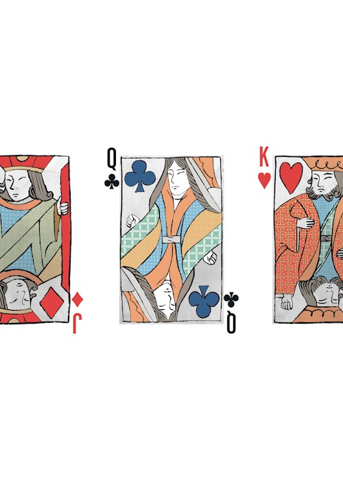 The inspiration for this desk started with the feeling of nostalgia. Growing up in an Asian household, my parents used to decorate our house with scroll paintings of origins of Chinese and Japanese culture. Since then, I have always wanted to illustrate a design onto a deck of cards, like an art piece that you can enjoy and hold to play with. Knowing I could not do justice to the art pieces from the past, I decided to pick out my favorite parts of the paintings and fashion them with a modern twist. In addition to its elegance, there are various potatoes scattered across the back design to create a fun element for your eyes to enjoy! This is the Gilded Edition – cards are gilded with holographic sparkle foil. Printed by Legends Playing Cards.