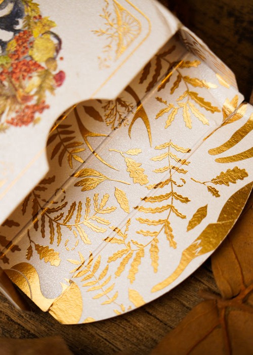 Inspired by the 19th century collage painting, this deck features colorful sprites and plants, symbolizing the elves’ bountiful harvest and pure souls. Each tuck case reflects the elves’ lifestyle, with a gradient gold finish and added relief, watercolor, and gilded text details. Limited edition badgers, squirrels, and owls, with a custom seal.