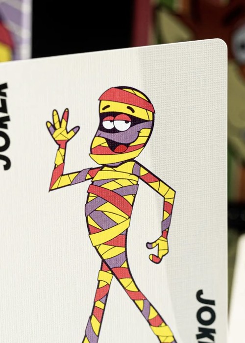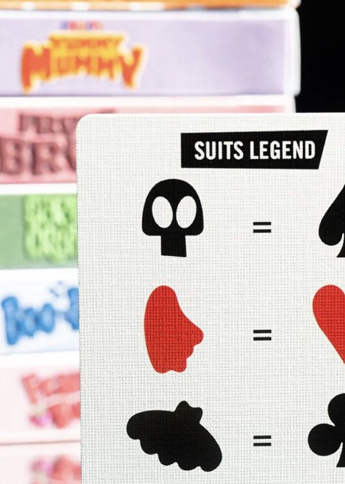FRUITY YUMMY MUMMY™ first appeared in 1988 and went back to his crypt in 1992. Mr. Mummy came back from the dead in 2013 for the first time since his early retirement and has wowed cereal fans with his wild fruit flavor. We are proud to present FRUITY YUMMY MUMMY™ here in his very own deck of custom playing cards. Each deck playfully highlights the distinct personality and color palette of your favorite Monster. Featuring 56 playing cards per package—each one completely custom. These fun cards utilize a completely unique set of card suits. We spent many hours in the laboratory inventing details to make this project atmospherically spectacular for autumn. Housed in a custom tuck box with deep embossing and spot UV elements. Printed on vintage feeling and looking paper to give you the ultimate retro cereal experience.