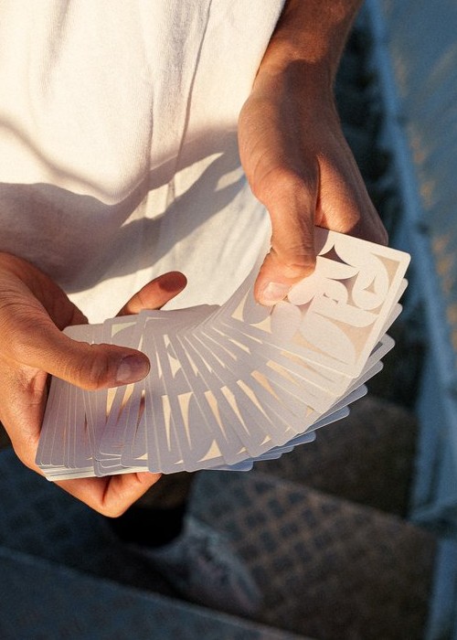 The follow-up to our popular Holo Error is hot off the press. Razor-sharp holographic blades pierce the negative space of the card canvas, forging a light, summery deck.