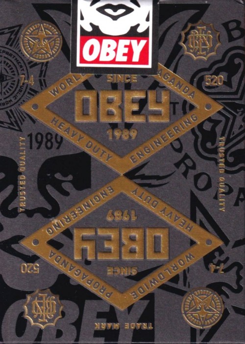 Obey Gold Edition Features art from different eras of Obey, made famous by Shepard Fairey. Each deck has a unique back design and packaging, printed with multiple layers of foil stamping and sculptured emboss.
