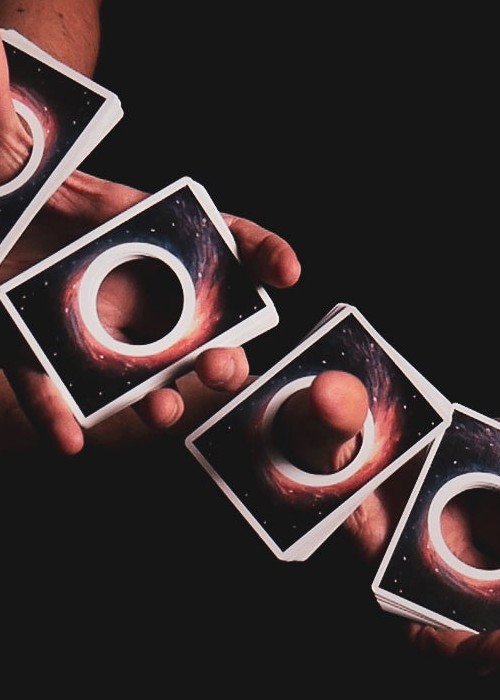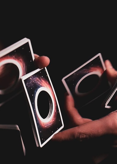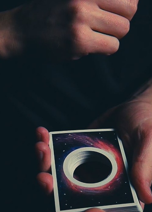 From the 2017 mind of Joe Feldpausch comes the Black Hole Edition Orbits! Joe and I have been talking about this idea for years but never found a proper way to accomplish what we wanted so we shelved it. 7 years later, we found a way to bring his idea to life and turned it into a polished final product with the help of my other half, the legend himself, Daniel Schneider on the artwork. The cards were printed at Cartamundi and have been in pre-production for over a year now. It took a lot for us to get to this point. The hole is the exact dimensions of the inside of our signature Orbit O on the back design. All the card faces are warped around the Black Hole. The deck opens the door to new grips, new moves, and a completely new look and feel. We plan on making at least a few more editions of these. This deck is for cardists, magicians, collectors, and space geeks alike. Come see what’s inside a black hole.