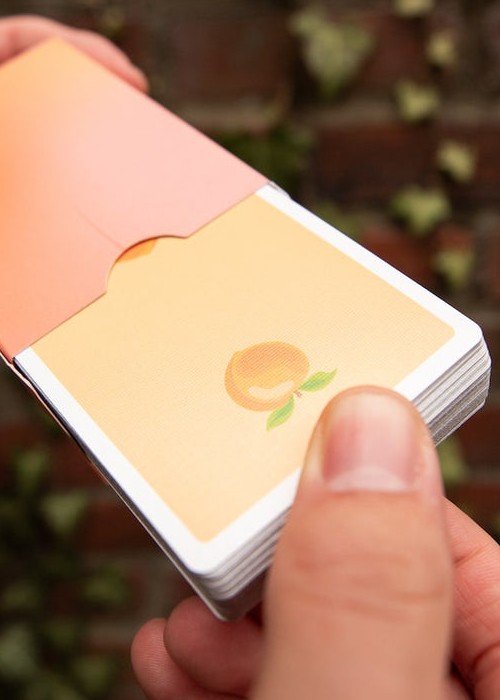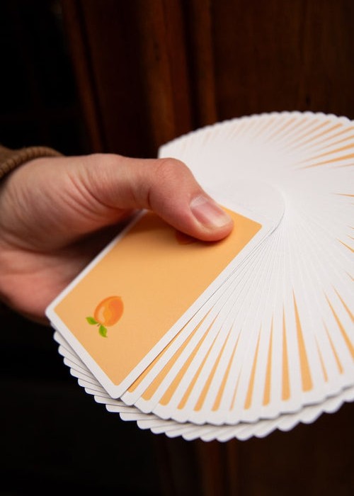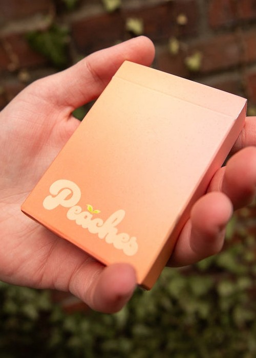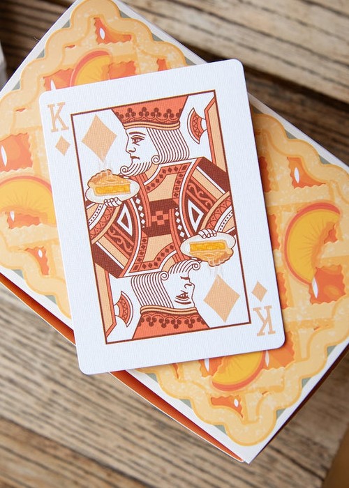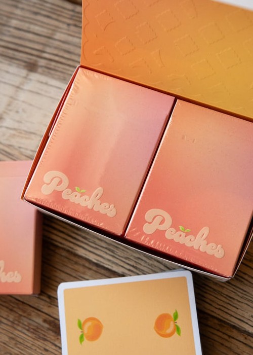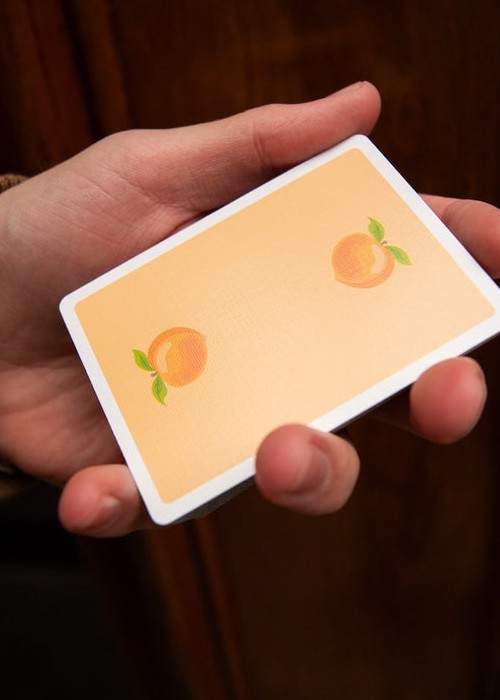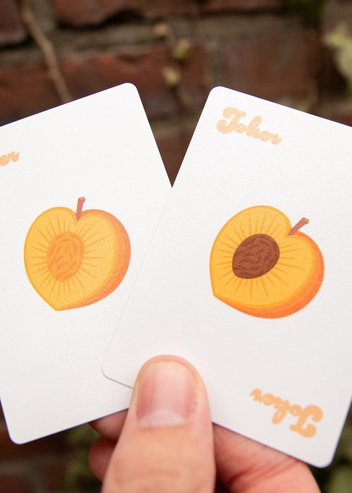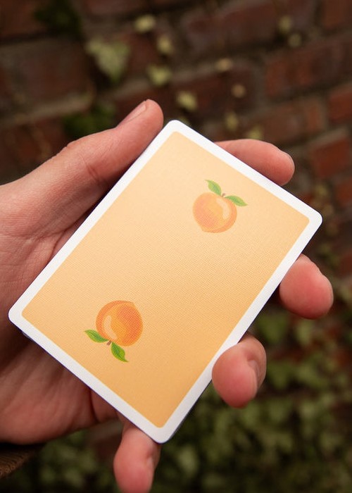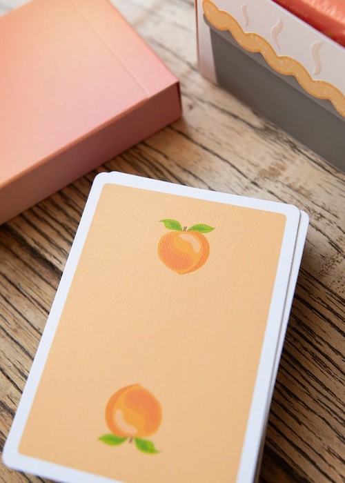 It is FINALLY TIME for a highly requested fruit to join the OPC family! Peaches are here for summer! It has taken a while for these to be ready for release, but we promise it was worth the wait! Our amazing designer Alexis really knocked this one out of the park! We went for a throw back style when designing the peach itself on the back. We then added peach themed items to the courts in true OPC style. The tuck box on this deck is also fitting to peaches! Not only does it look like a peach, but it is soft like one too! If you order 6 decks of Peaches, they will be baked right into your own peach cobbler half brick box!