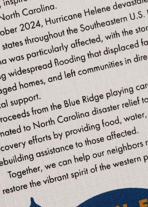 Hurricane Helene caused widespread catastrophic destruction in the North Carolina Mountains, wiping out roads, destroying towns, and leaving many without essential resources. In response to this devastation, we are creating The Blue Ridge Relief Playing Cards to help rebuild these communities and provide life-sustaining food and resources to the residents affected.