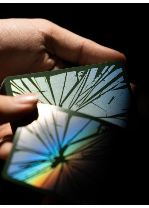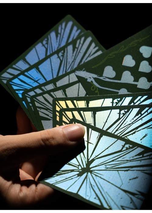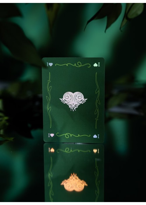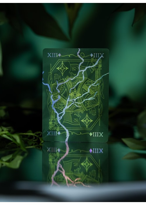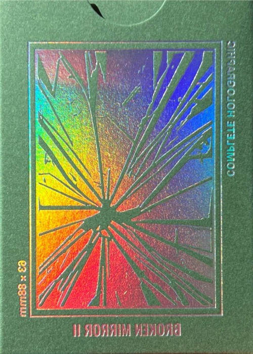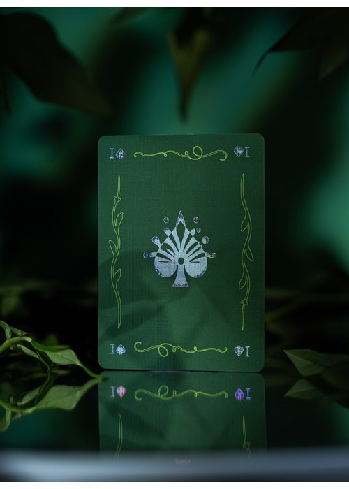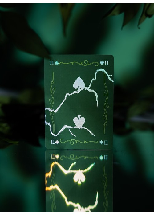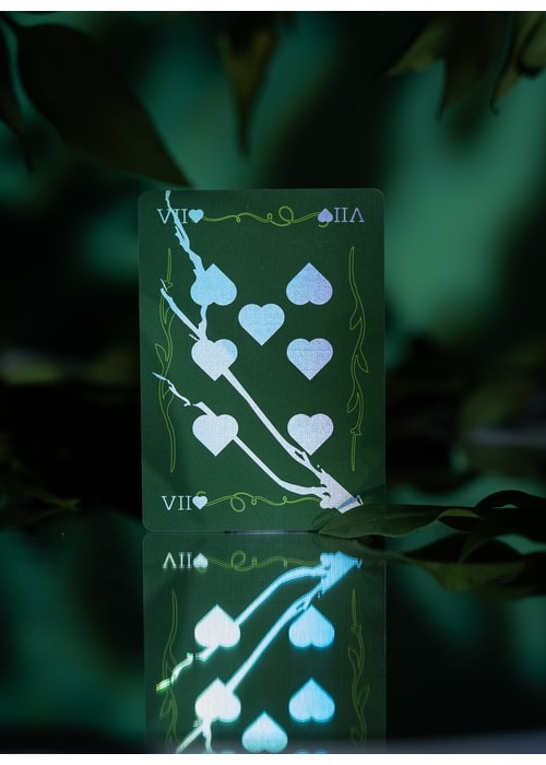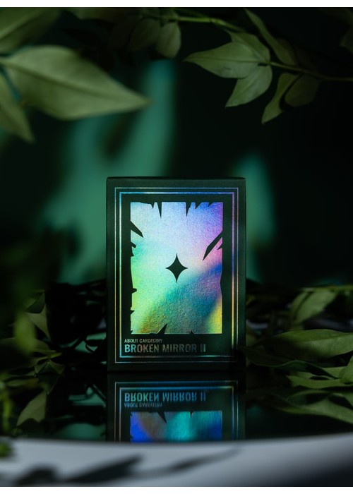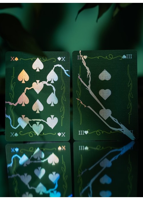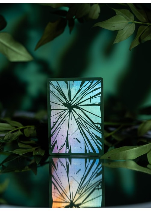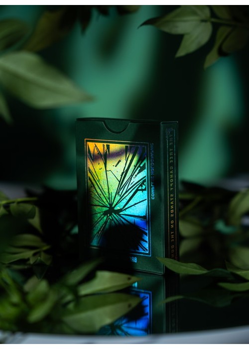 The second version of BROKEN MIRROR by Xiang of AboutCardistry. It takes an inspiration from the Renaissance Era – when the first practical glass mirrors were crafted in Venice – in which imagined a tree canopy under the cracked glass dome. The design turns the previous edition into green color, with some adjustments to the artworks (such as the custom Aces pips) to feature greenery with full-bleed forest green background of both sides. The pips along with the cracks on the Courts and Numbers are holographic foiled.