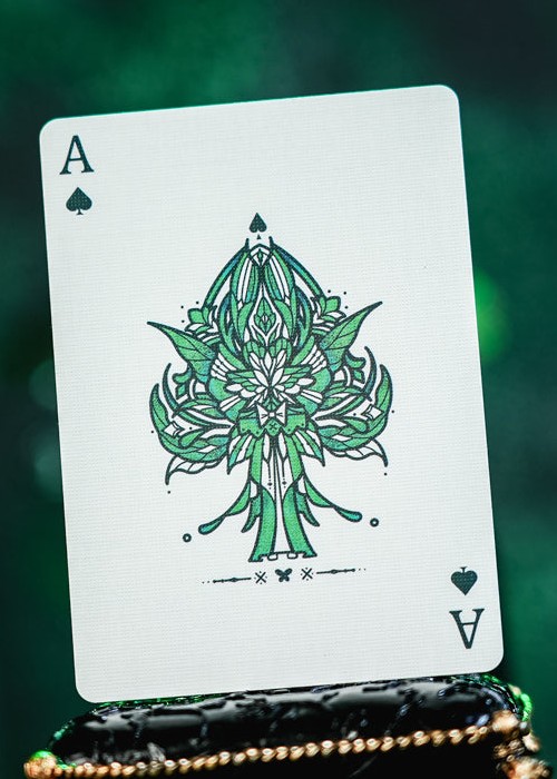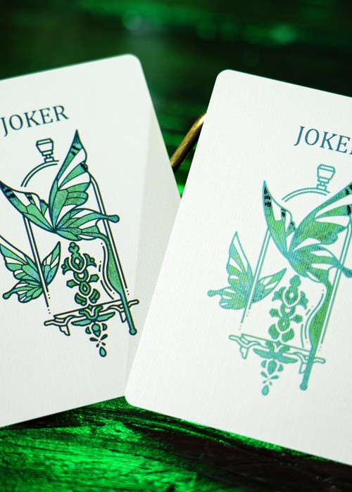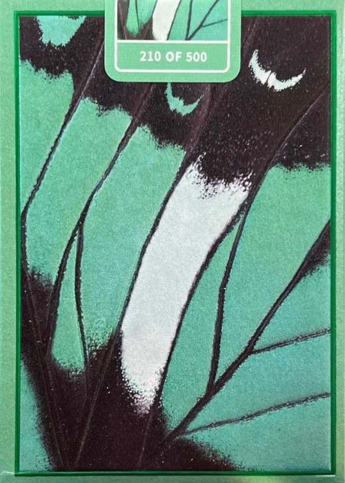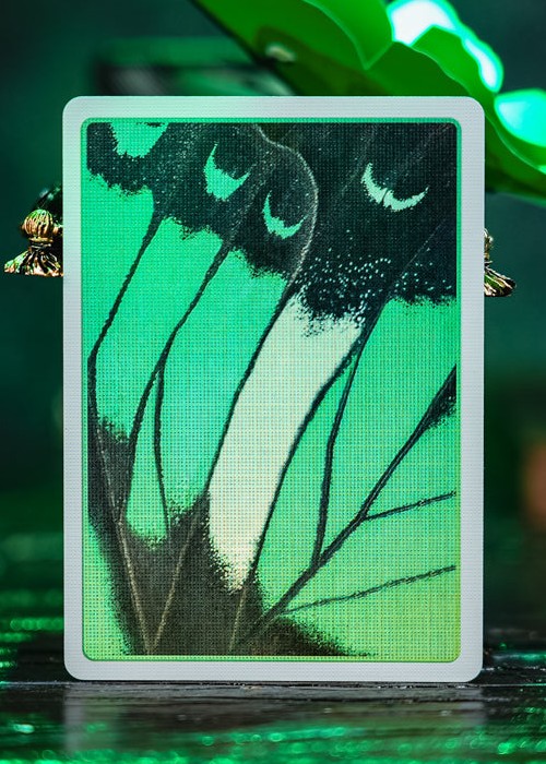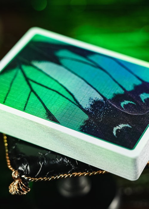 This version does not feature a die-cut design; instead, the image of the green-banded swallowtail butterfly is displayed on the front of the tuck box, enhanced by delicate embossing that brings a tactile dimension to its visual beauty. On the card backs, cold foil is applied with precision, so that within the vein-divided sections of the butterfly’s wings, a subtle pale-green sheen shimmers through, creating a vivid and luminous effect. The deck’s color scheme is green, with the back featuring the fragment of a Green-banded Swallowtail butterfly wing.
