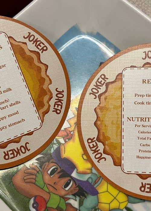 Egg Tart Temptation Playing Cards feature the most thematic design of this series. The deck is designed as if its an actual egg tart with its takeout box. The cards are in circle shape, with the back design is the fully-baked egg tart. The faces design is adapted on the shape. The Courts feature characters: Jacks as waiters, Queens as customers, Kings as chefs. The deck comes with a rubber band, presumably for closing the box tight.