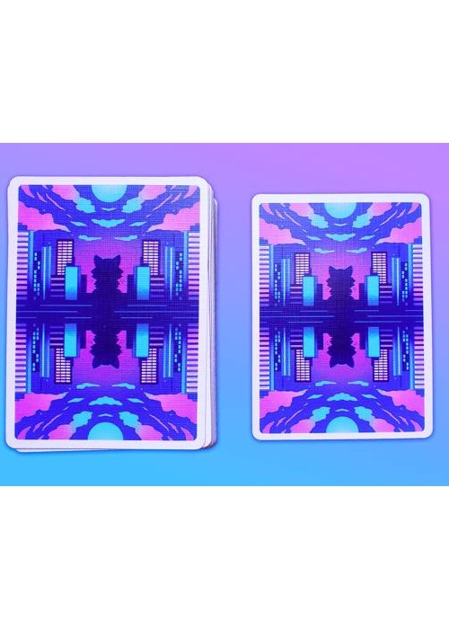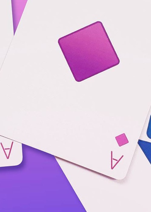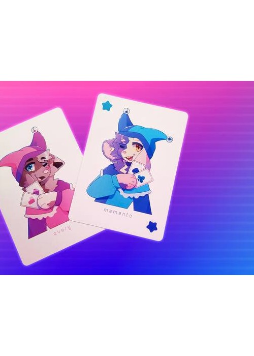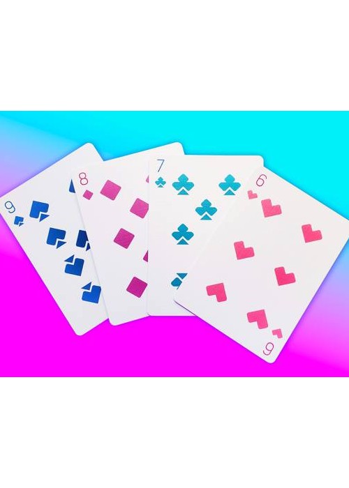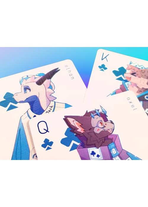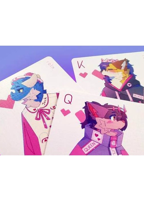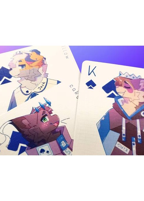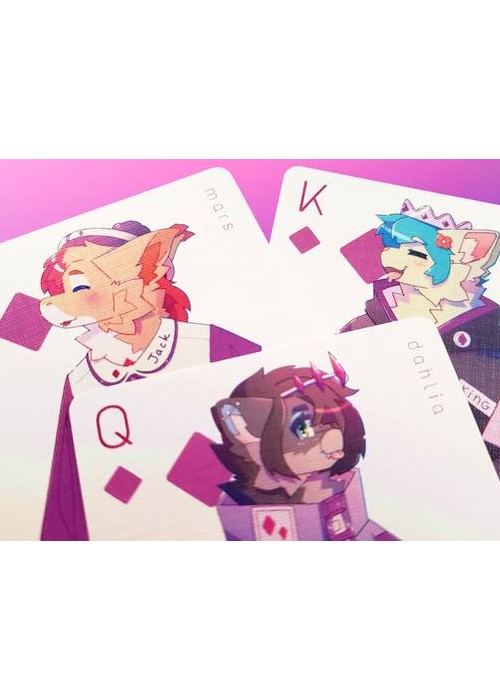 The Courts feature anthropomorphic characters wearing cute outfits – each has a name [these characters belong to their respective owners]. Each suit has its own color and its own expression, with ranks determine the intensity of the emotion. The colors are pink, purple, blue and teal. The Pips and Indices for the Numbers and Aces are in minimalist style. The Jokers feature the characters of the character and the partner.