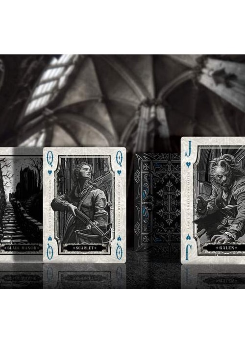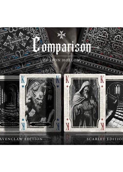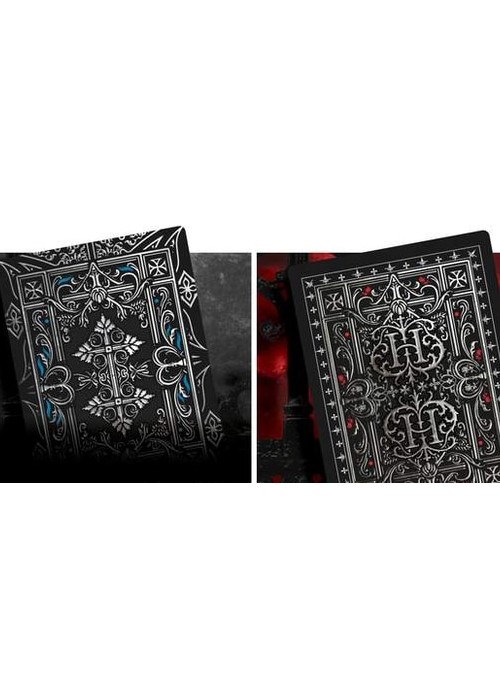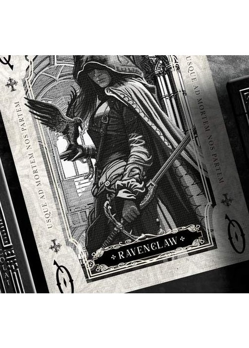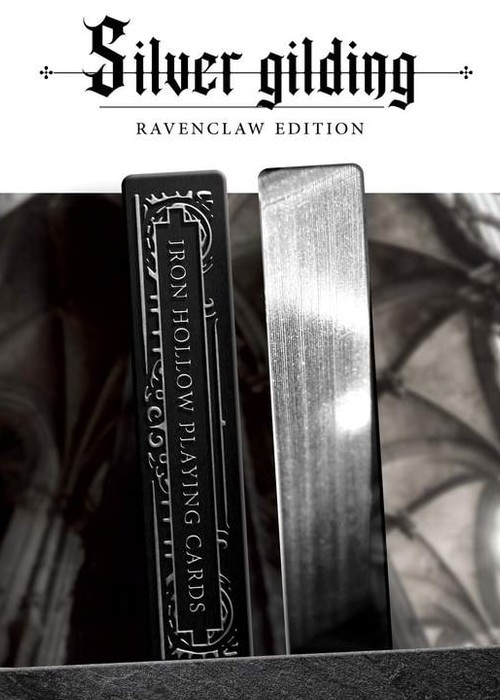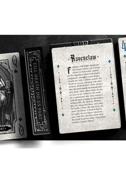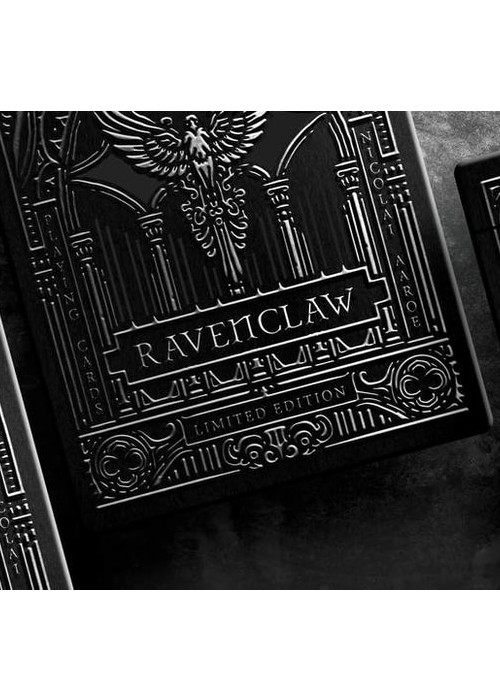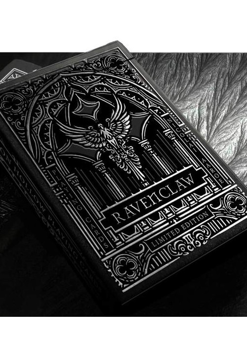 Ravenclaw features tuck with gothic ornamentation, taking inspiration from gothic portals of mausoleums and Victorian tomb stones, while featuring an iconic raven. It is manufactured with black and silver foil, strategically embossed on a matte, black stock. The red cards color is swapped to blue, and the cards have silver foil gilding.