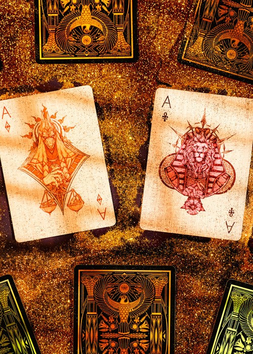 The Mythology of Egyptian features the majestic and mysterious Egyptian mythology. With black and gold as the main color scheme, it conceals a breathtaking ancient Egyptian legend, embodying the pharaoh’s supreme authority and mysterious power. The box embodies the ancient and sacred atmosphere, carefully embossing elements such as the mighty pharaoh with deity statues, giving it a rich, historical, and three-dimensional feel. Exquisite hieroglyphic patterns and gold foil decorations, like golden sand along the Nile, extend to every detail of the cards. Each card perfectly blends exquisite hand-drawn illustrations with high-end craftmanship, presenting the Courts and Aces with finely detailed depictions of famous Egyptian deities. Their glory flows along the Nile, the whispers of ancient temples echo for millennia, and the millennia-old heritage is etched in hieroglyphs. All of it is captured in these small cards. Hold the cards in your hands, and it feels you’re touching the mysterious power of ancient Egypt.