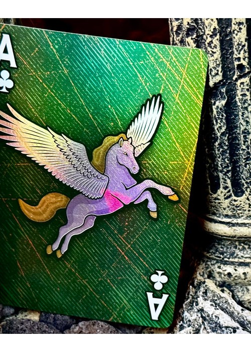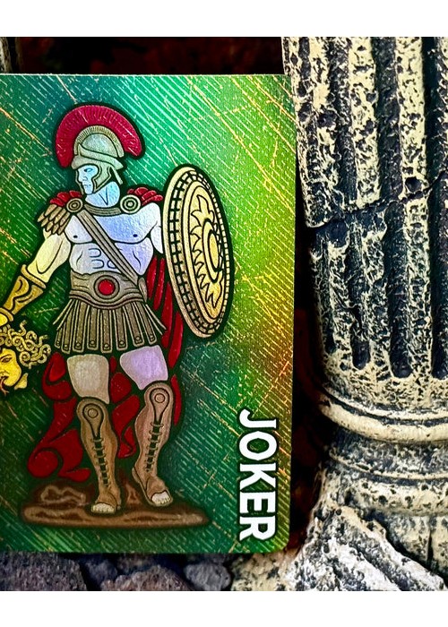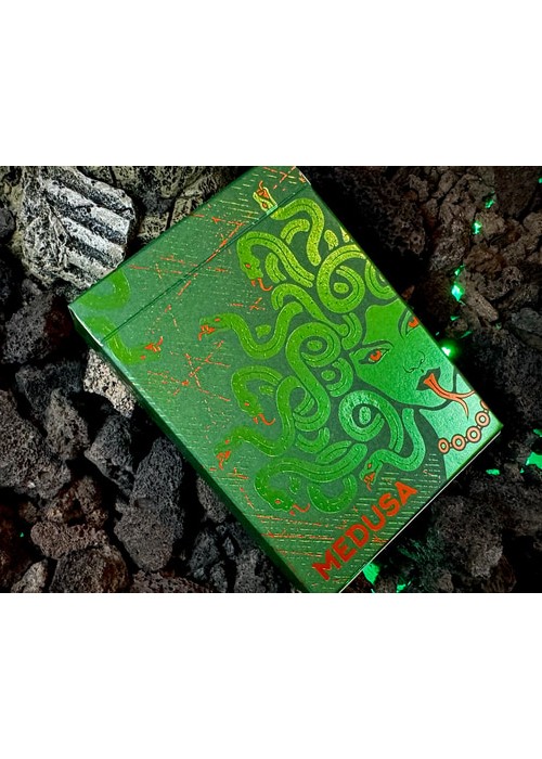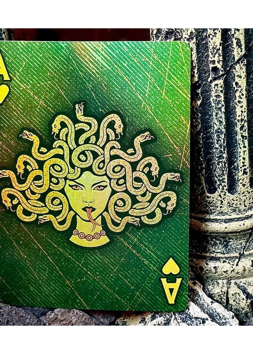 The Medusa Back Card features a borderless design formed from dozens of snakes. The orange snakes in the center draw the eye, and the green snakes form a mesmerizing swirl pattern. The Aces include a Green Medusa (Spade), the winged horse Pegasus (Club), a Gold Medusa (Heart) and the sword and shield of Perseus (Diamond). The Jokers feature the demigod Perseus, who is holding the head of Medusa. The Classic Courts are flanked with green and gold snake clusters to cement home the theme. Everything comes together to create a cool look that is very playable.