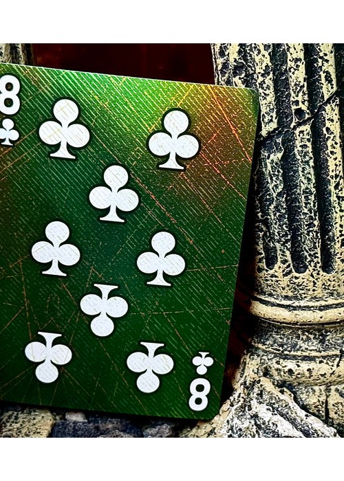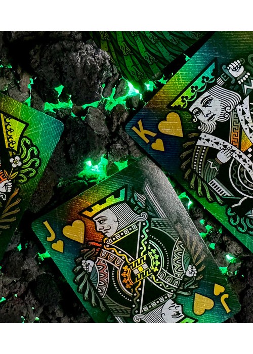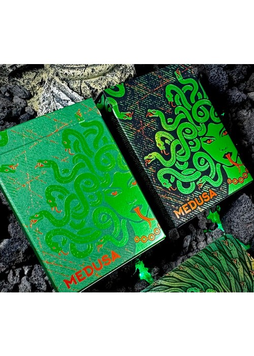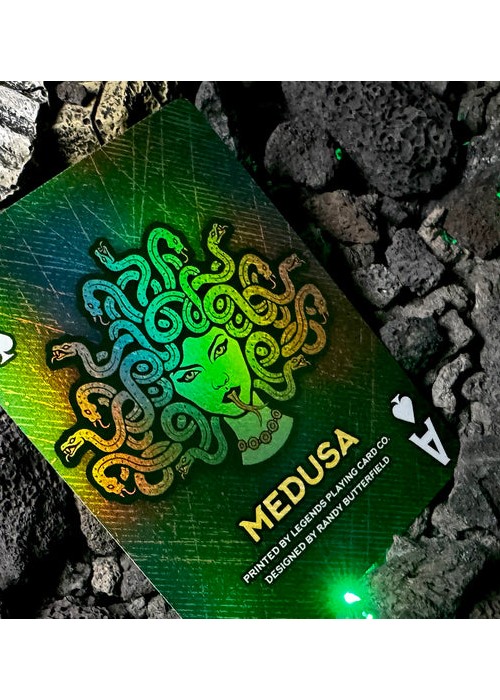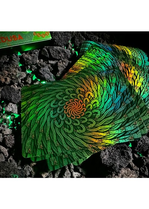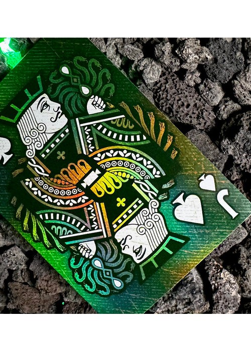 Inspired by Greek Mythology, the Medusa Deck has a mesmerizing Back design of green and orange snakes. Printed by Legends Playing Card Co., the Cards are printed on a Holographic Foil material (Faces and Backs)! Continuing the Legends tradition of constant experimentation and innovation, the Card edges feature ULTRA GREEN, which is an all-new dyed light green paper for playing cards. ULTRA GREEN does not chip, and the deck will look and feel new for much longer.