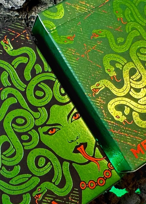 The design for the Tuck Box highlights a closeup of Medusa, everyone’s favorite Gorgon sister. Medusa’s seductive face fills most of the front of the Tuck and wraps around to the side and back of the Tuck. The Green and Orange Foils are printed on a premium Green Matte paper stock – This is a LIMITED EDITION variant of the deck; it contains the same cards. Only 500 decks made, KICKSTARTER Exclusive. The Medusa Deck is perfect for any Collector, Card Player, Magician, Flourisher or fan of Greek Mythology!