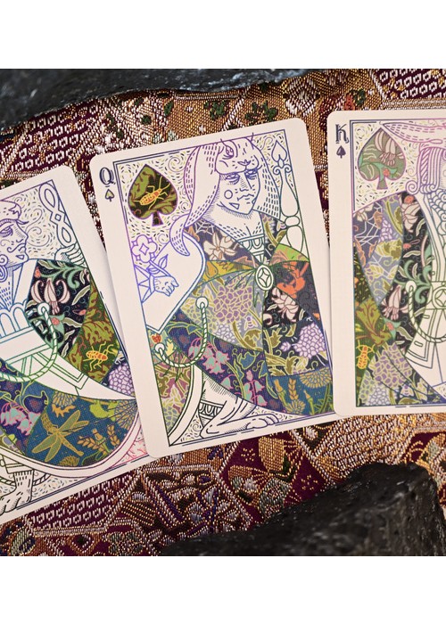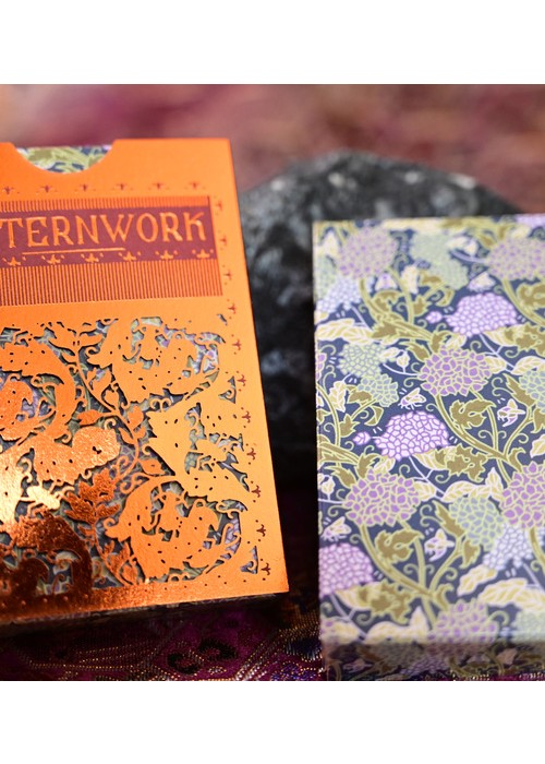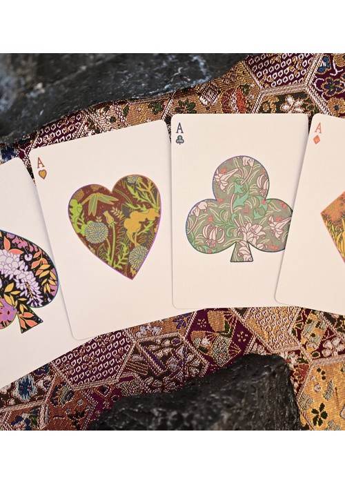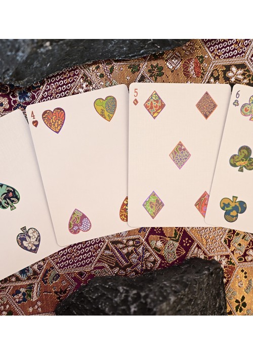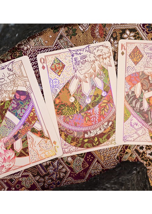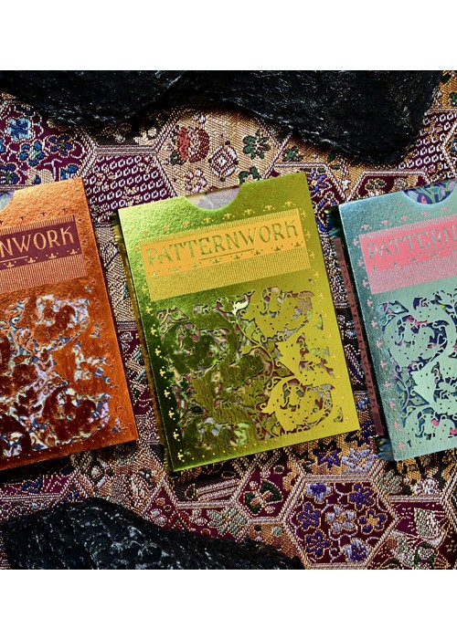 Patternwork Playing Cards is an exploration of Japanese patterns fused with English style tapestry. The tuck box is composed of two parts: the fully foiled sleeve with extreme precision laser cut holes pattern and the fully covered patterned box. The cards are gilded with metallic foil with the back design of full-bleed borderless pattern. Most of the artworks on the deck appears as outlines, with patterns are the main focus of the deck.