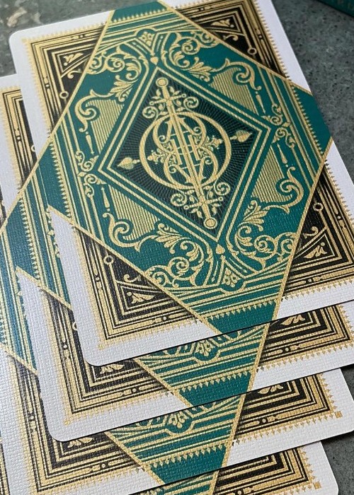 Redemption Players Playing Cards is a classic standard yet custom deck of cards designed by Lotrek. It is inspired from REDEMPTION STORIES; Patreon exclusive deck series only available to Oath Playing Cards patrons – notice how the broken border back design is a diamond shape which is a reference to the die-cut window of the deck series deck sleeve. The cards printed using CMYK plus gold and silver metallic inks. Featuring my latest take on the standard courts, the decks are visually special and classy, while still very player-friendly. The tuck box is made of matte stock with embossing and three different metallic foil.