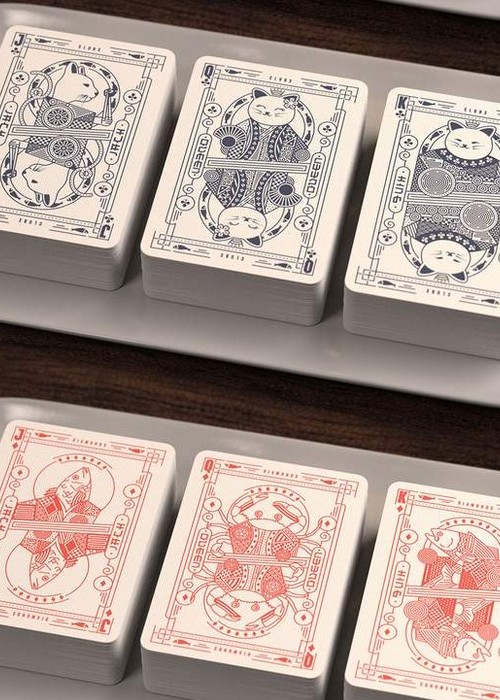 Presenting Sushi Playing Cards, a series of thematic playing cards based on Japanese iconic food, sushi. The artworks are designed by June Muhlada, and the cards are produced by Jackson Robinson. The series have three different variants, and they are based on the different type of sushi. The artworks feature clean graphic lines with minimalistic look. The Courts feature cute cats for the black suits and prominent seafood ingredients for the red suits.