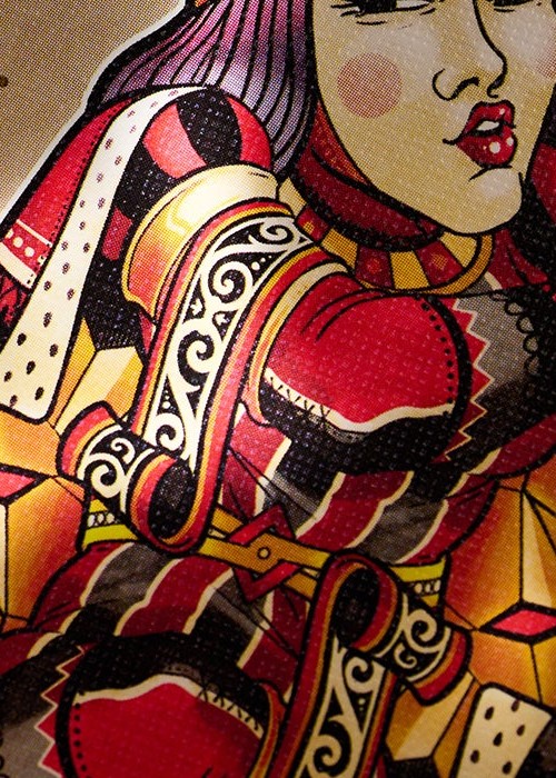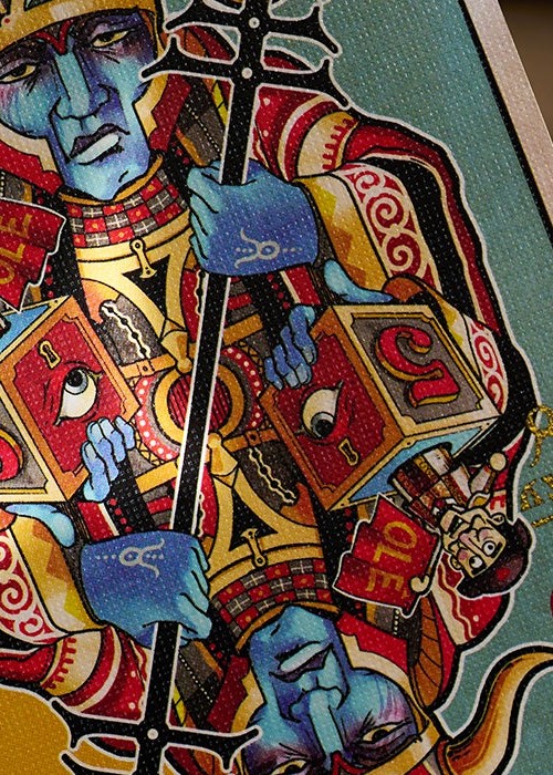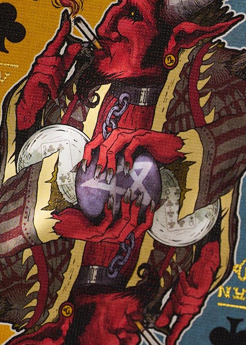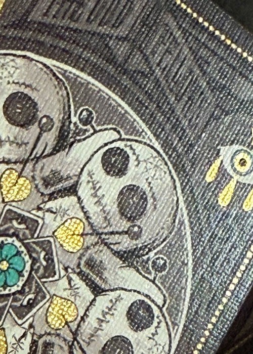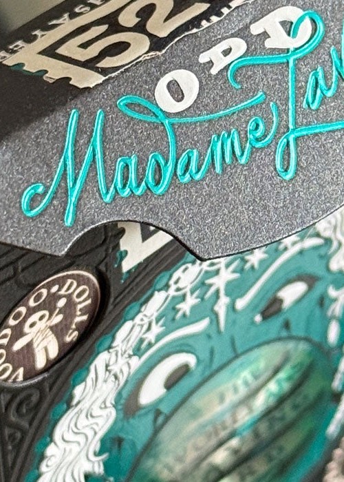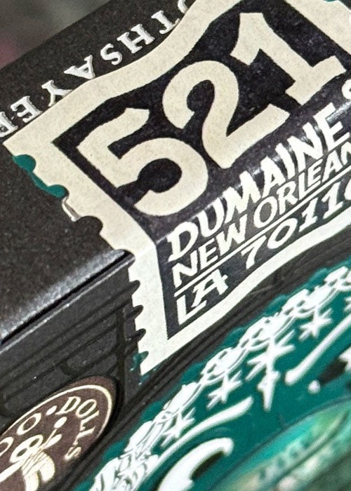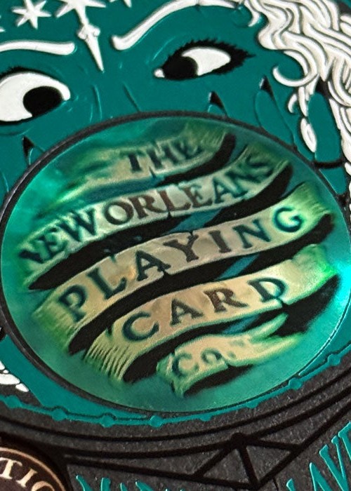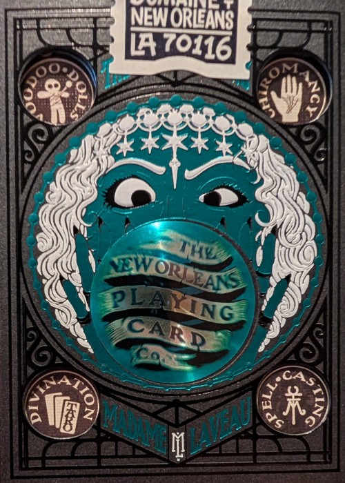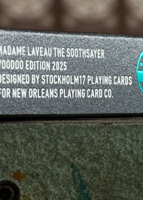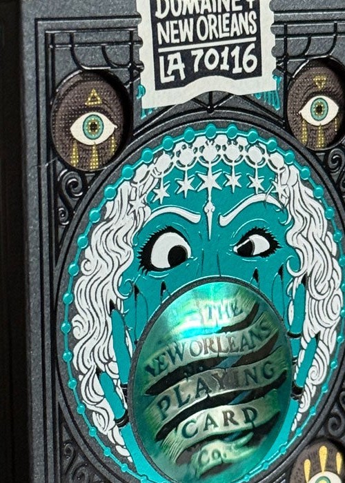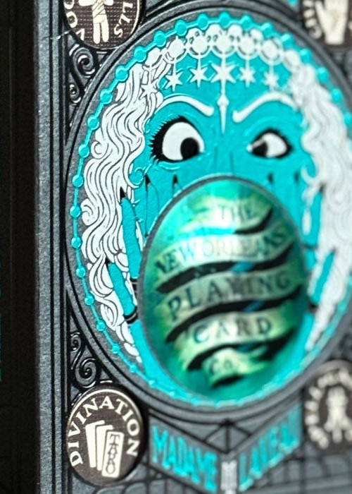 Created for New Orleans Playing Cards, this deck is sold at their physical shop in 521 Dumaine St, New Orleans, LA 70116, United States. For this variant of Madame Laveau, the tuck box is matte black with teal foil, and it comes with custom seal depicting the address of the the store. The 3D lenticular lens shows the name of the store. The card back design is colored black, with the edges are gilded with teal foil. All the artworks on the cards remain the same as the original, except for the artwork card that shows the illustration of the store’s entrance.
